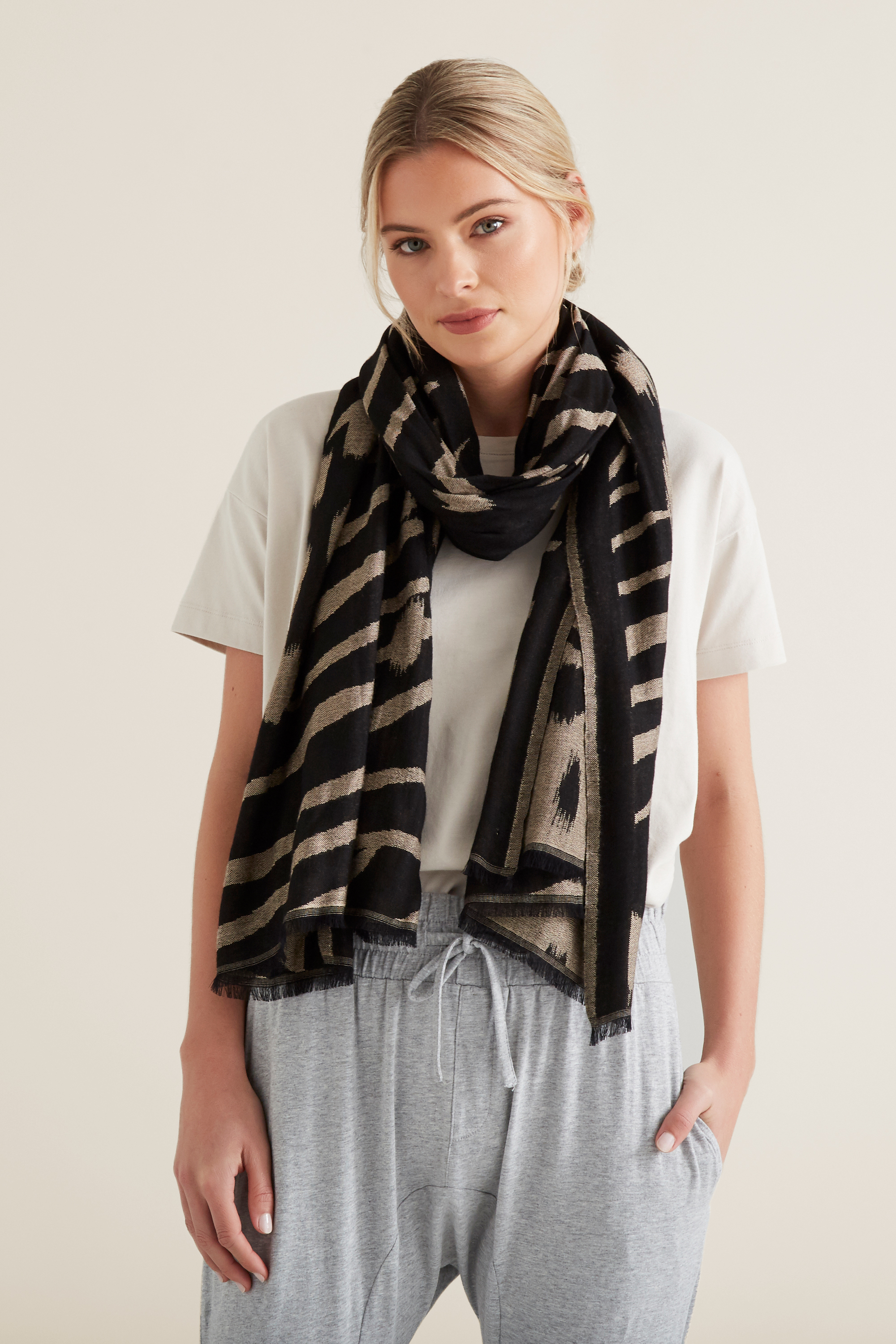 Complete your ensemble this season with this Abstract Animal Jacquard Scarf. Whether you decide to wear it as a necktie or head scarf, this striking print is sure to be on a high wardrobe rotation this season. Made from a soft Polyester blend, this Abstract Animal Jacquard Scarf is available in one size. For care instructions, please refer to the care label inside of the garment.