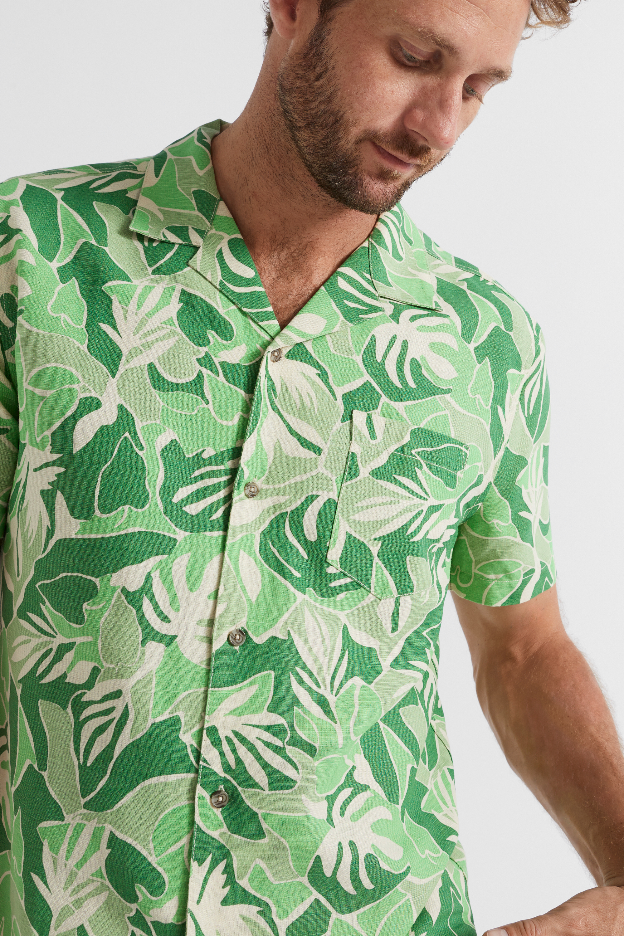 with an abstract foliage print, this shirt speaks to summer days. it is crafted from a premium blend of linen and cotton, and features short sleeves. the shirt buttons down the front.