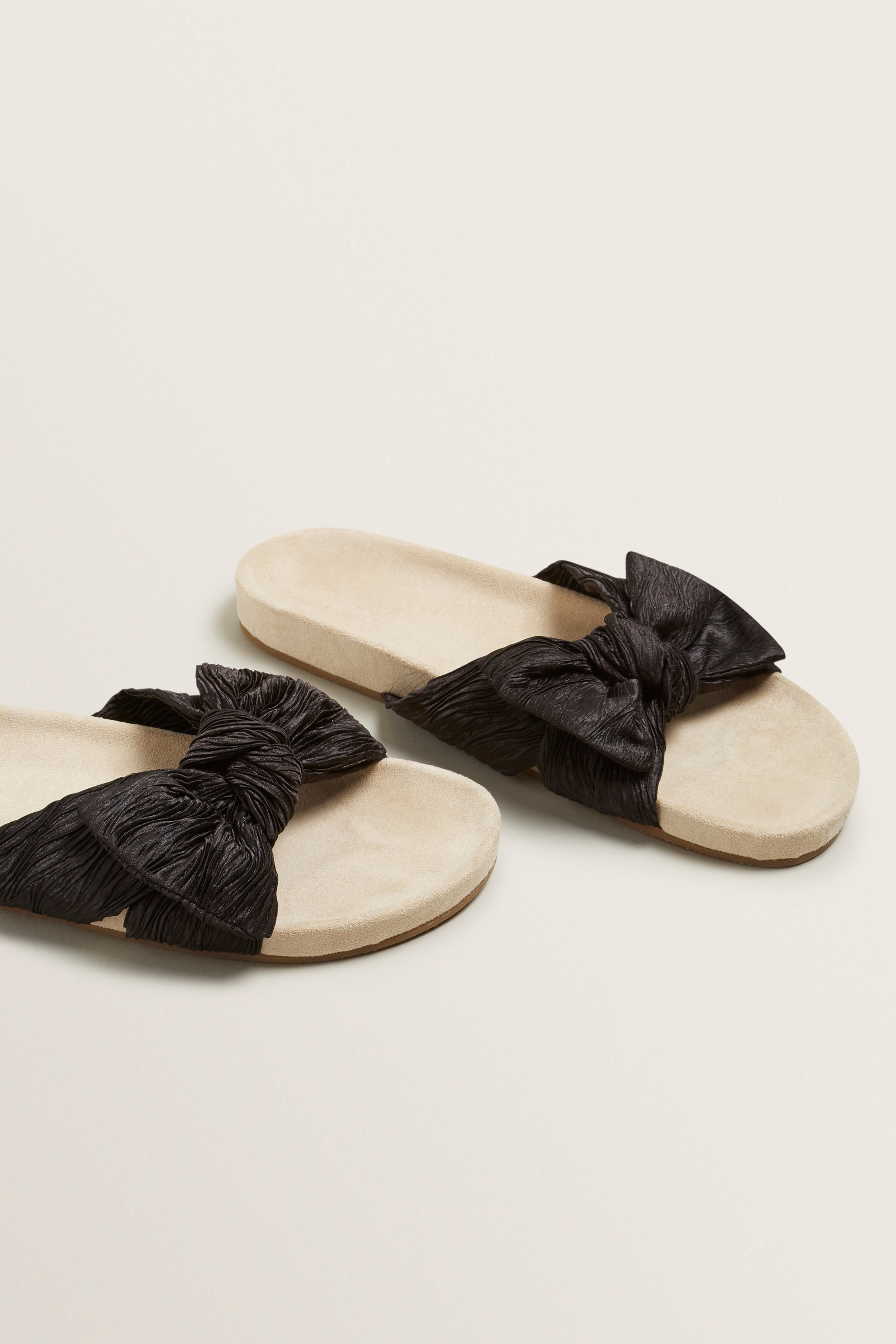 Adorned in a textured pleat, these Amy Bow Slides are detailed with a moulded foodbed, toe strap and decorative bow.