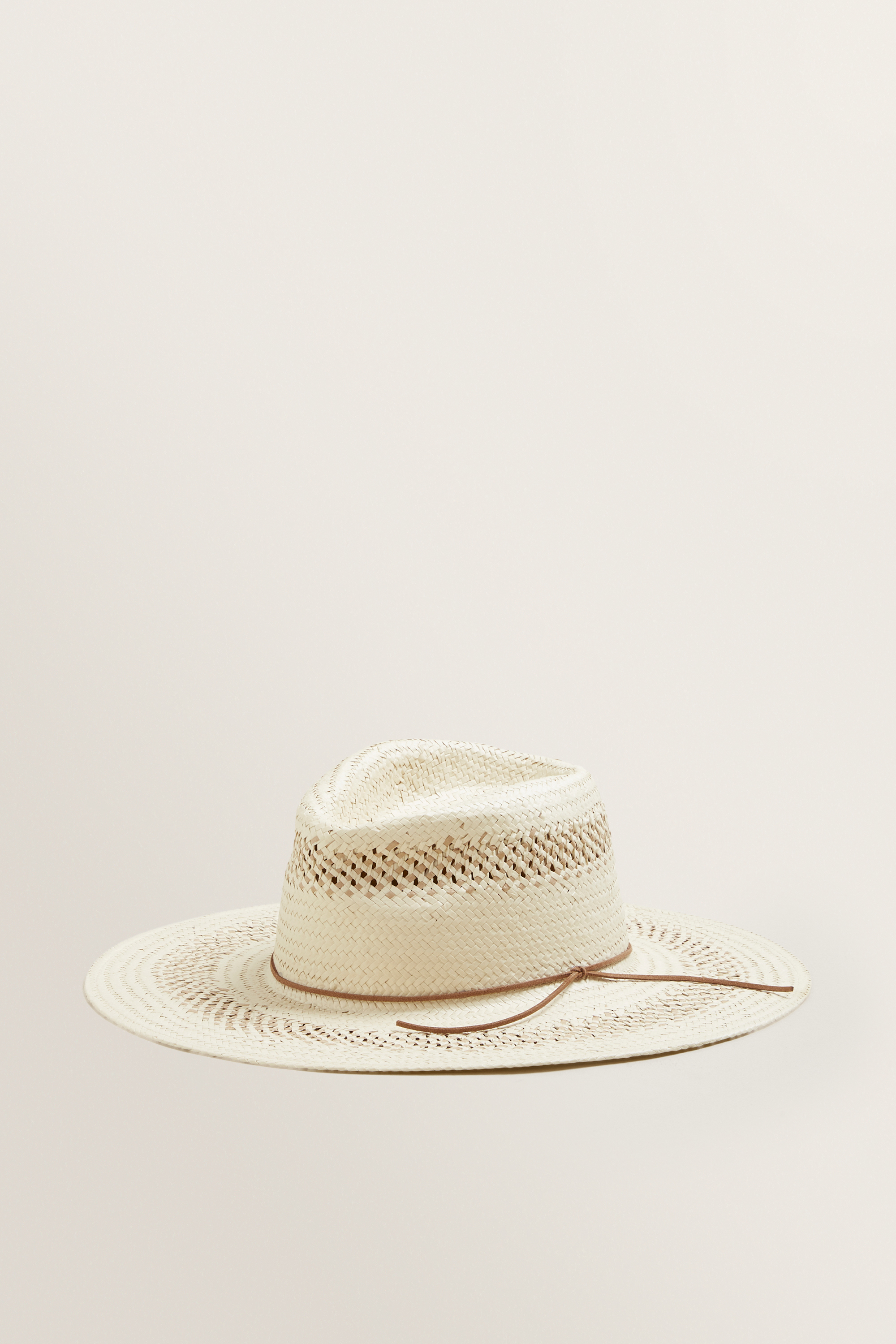 Woven from a paper straw, this Anna Fedora is detailed with a pinched crown, wide brim and leather-look trims.