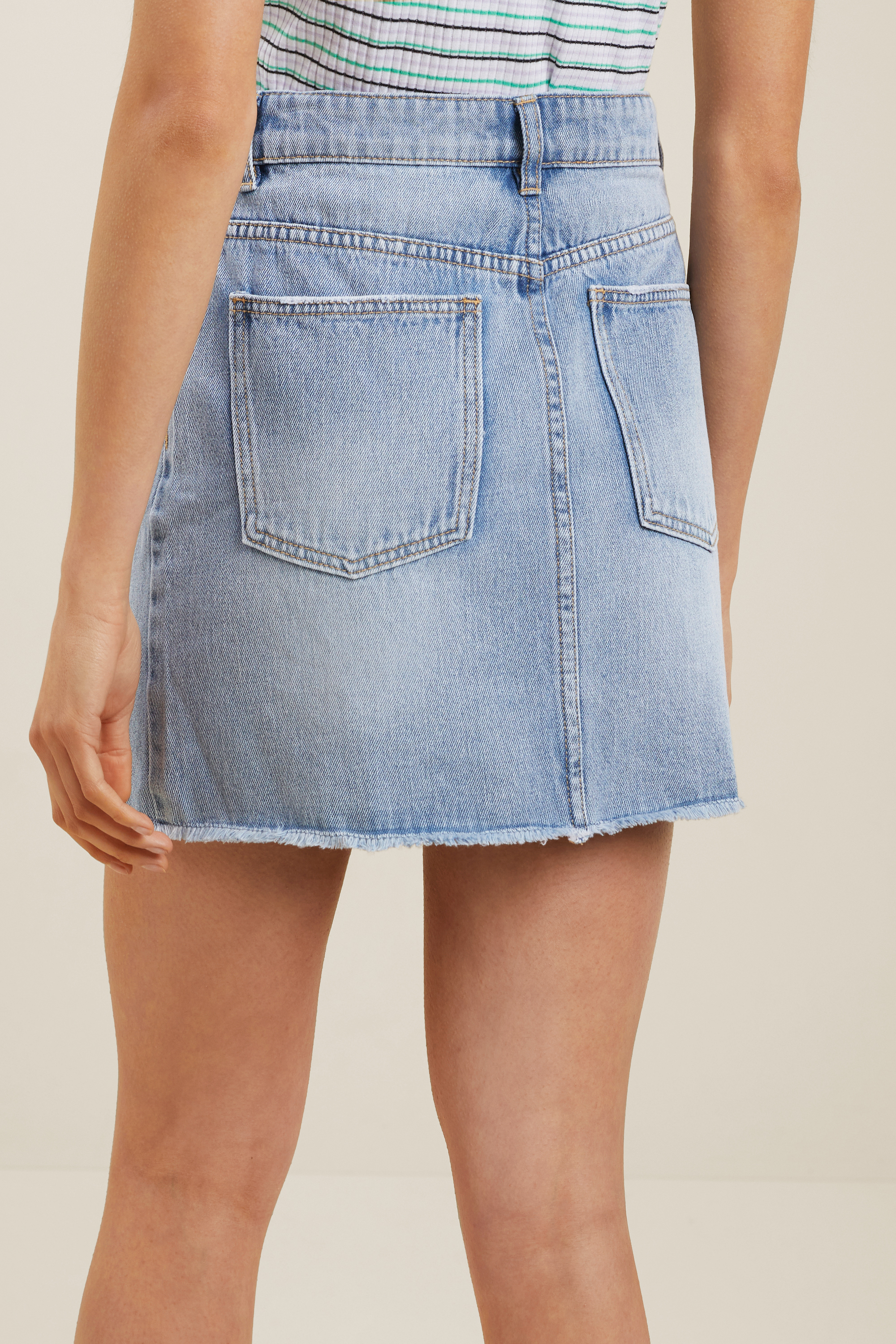 Crafted from 100% cotton in a classic light wash, this denim skirt will update any look. The asymmetric panel gives a hint of edge to the skirt, which has a frayed hem and A-line silhouette.