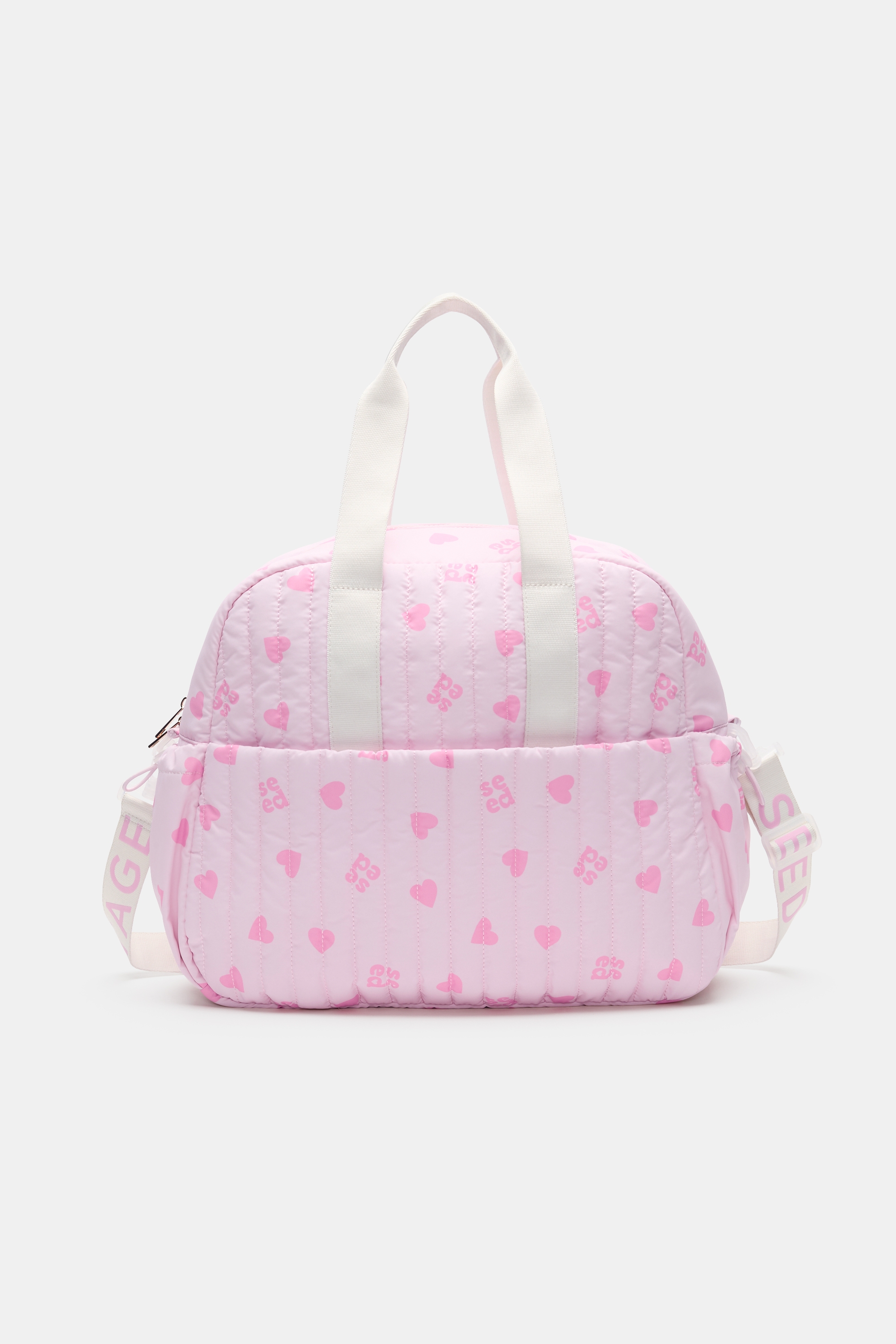 Carry it all in this quilted overnight bag, the perfect balance of practical and sweet. With a front pocket, side pockets, an internal slip pocket and zip closures, you'll find a spot for everything you need. The bag also features an adjustable crossbody strap and short carry handles. Choose between two adorable patterns, a croissant design or a heart and logo design.