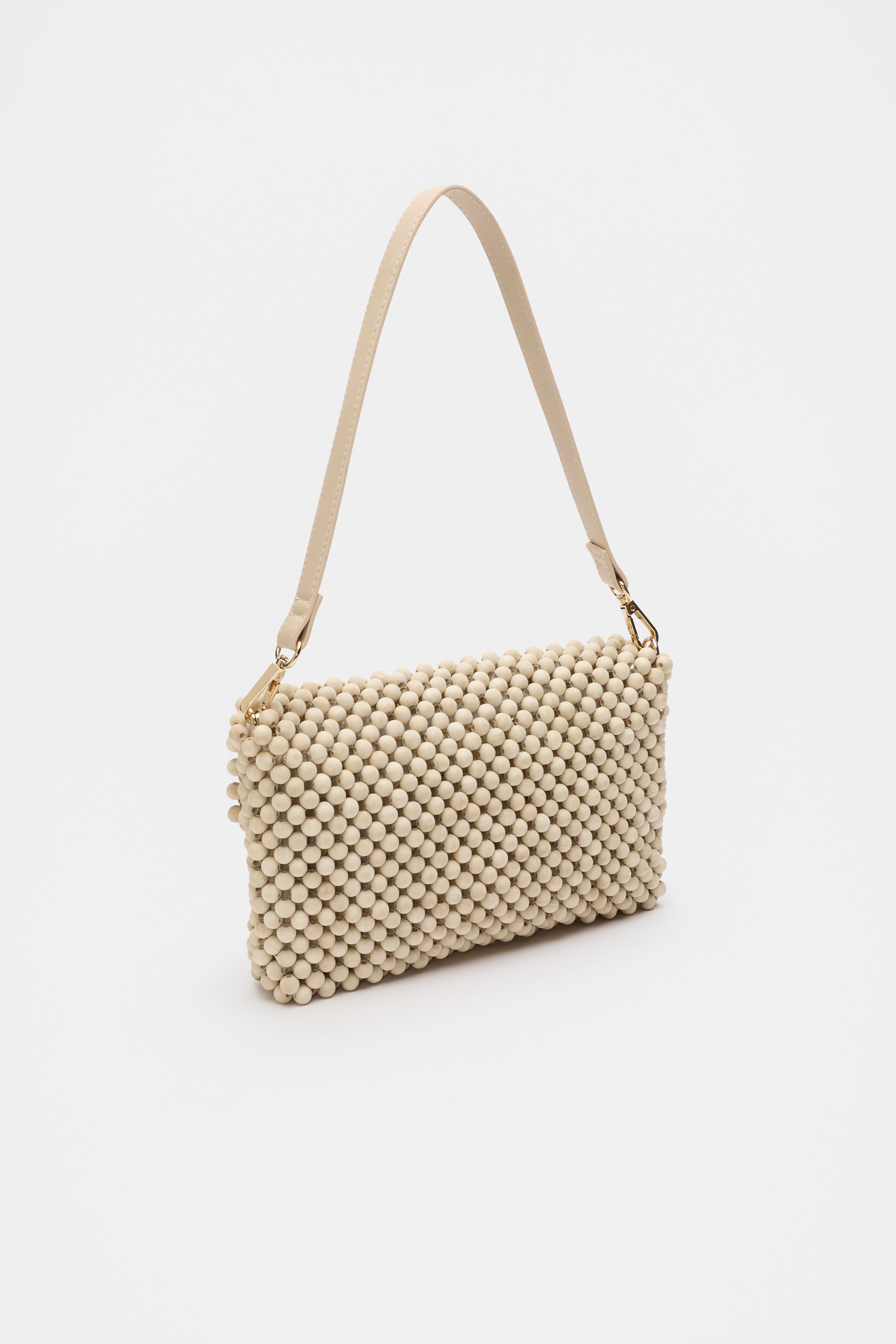The perfect addition to your summer wardrobe, this bag is a statement style featuring a design of wooden beads. It has a chic shoulder strap design, includes an internal zip pocket and secures with a magnetic closure.