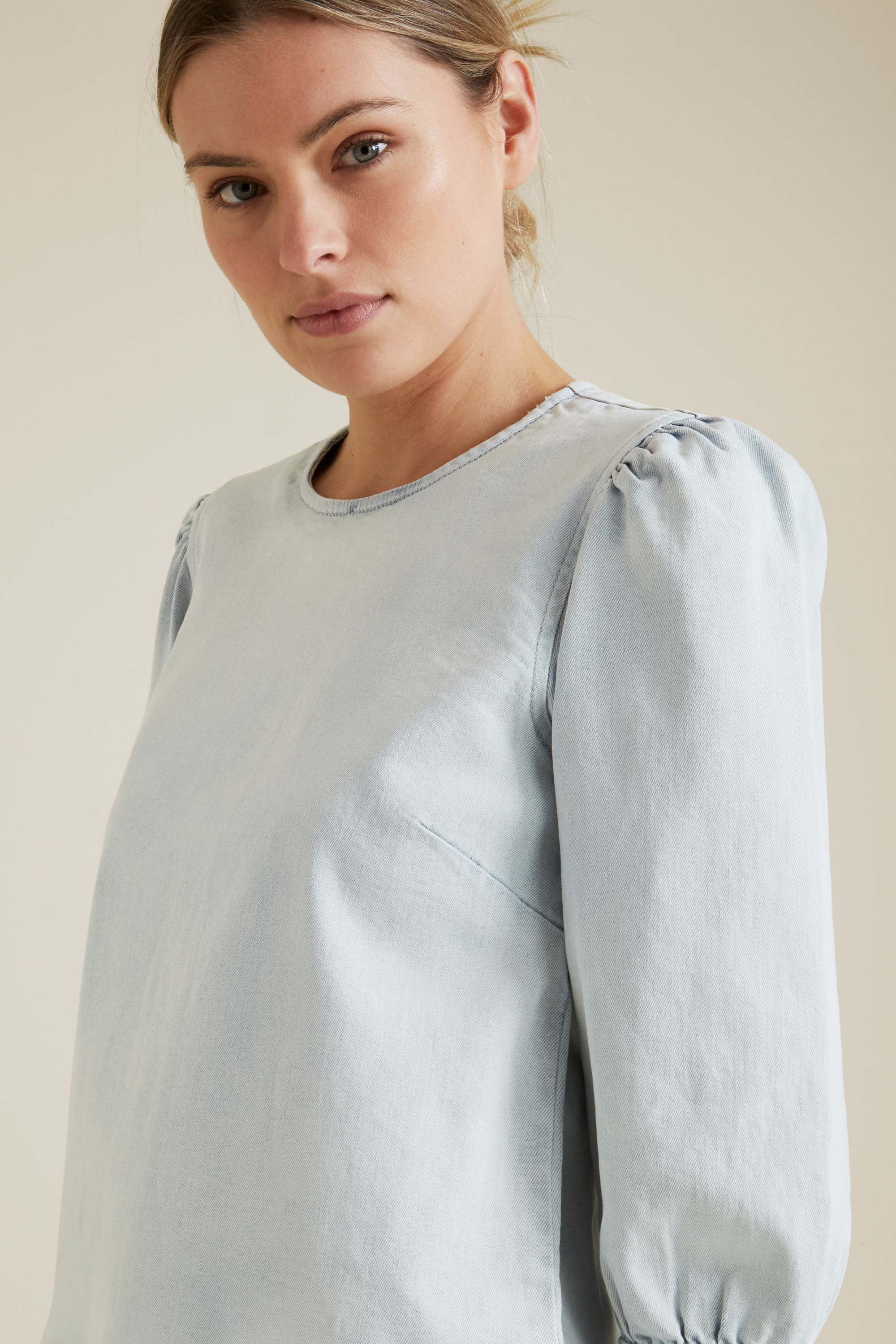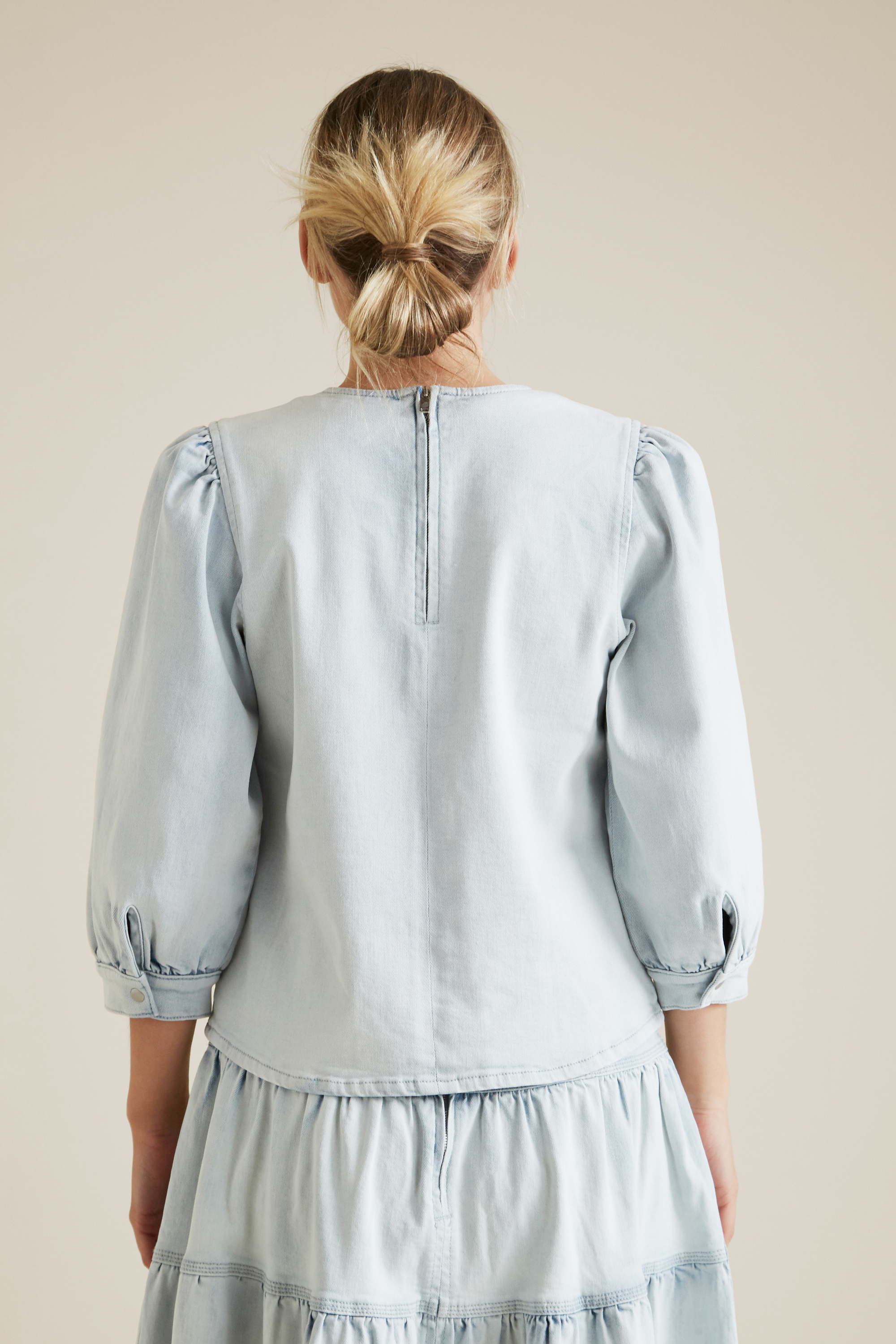 This beautifully detailed Denim Top is crafted from a mid-weight fabric, featuring an exposed zip closure on the center back and blouson sleeve detailing.