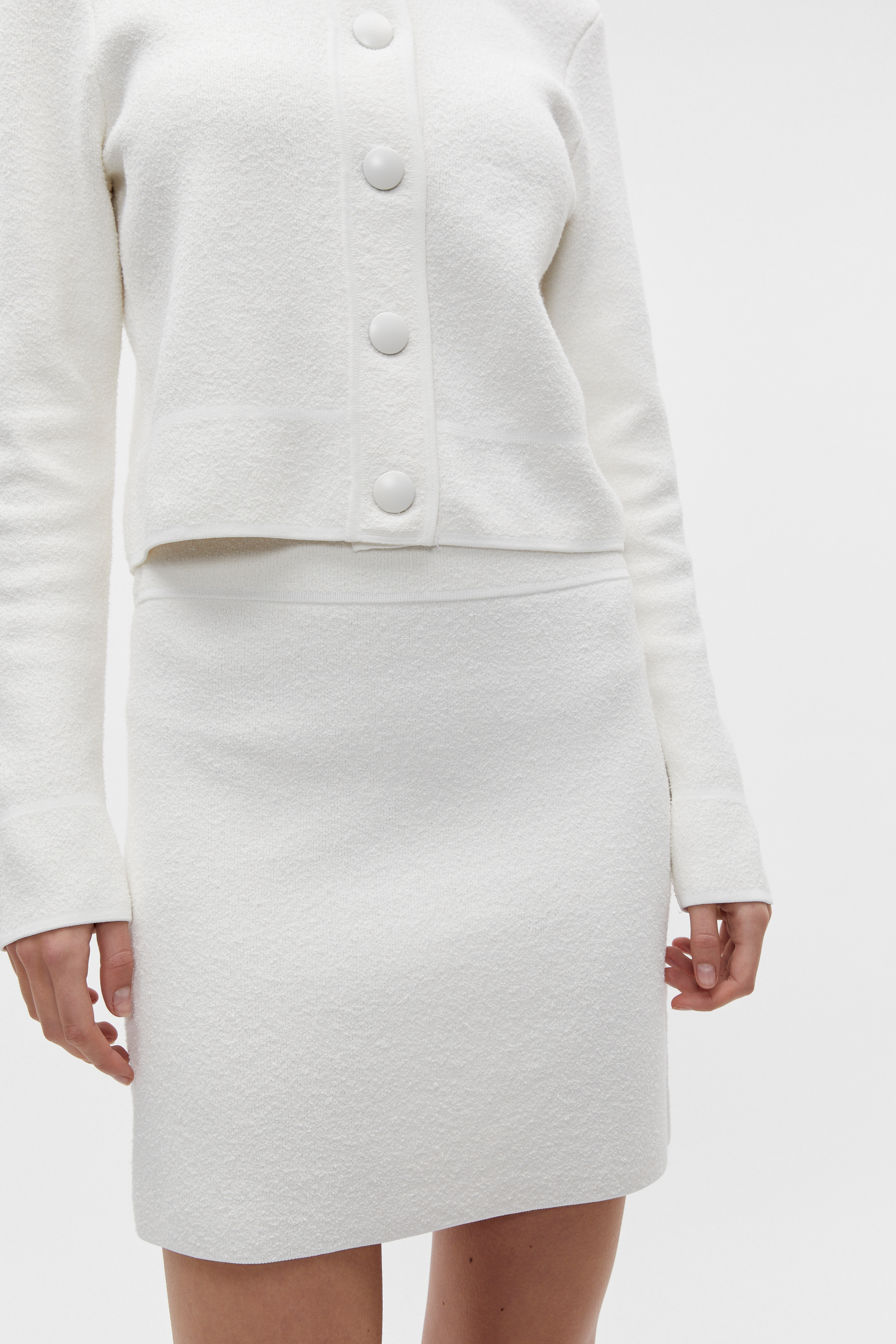 A chic styling option, this mini skirt is crafted from a textured boucle knit with comfortable stretch. It features an elasticated waistband and a slight A-line shape, and can be worn with the matching knit cardigan for a curated look.