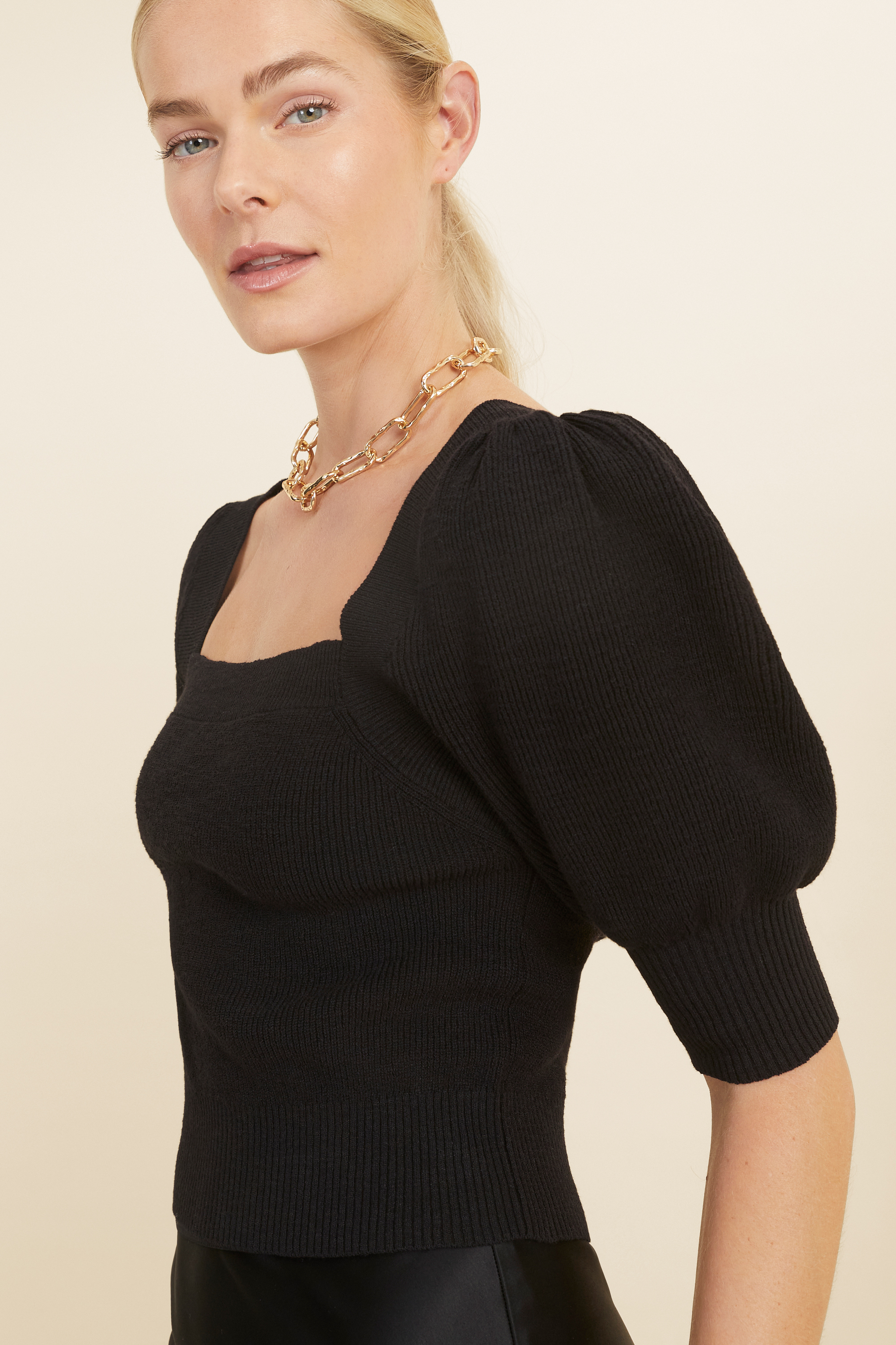 Designed in beautiful form fitting crop, this top is made from a super soft boucle knit. Featuring a square neckline, the short sleeve is designed in flattering puff sleeve with rib trims.