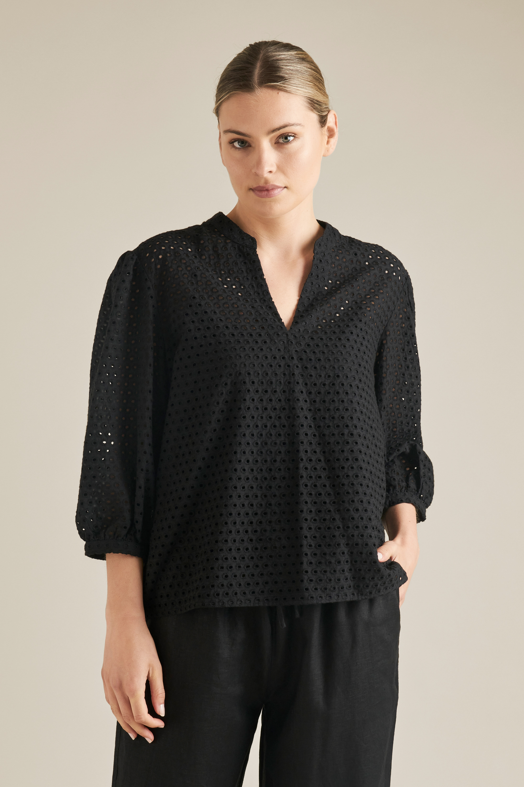 Made from 100% cotton, this Blouse features a v-neckline, blouson sleeve and all-over broderie detailing for added interest.