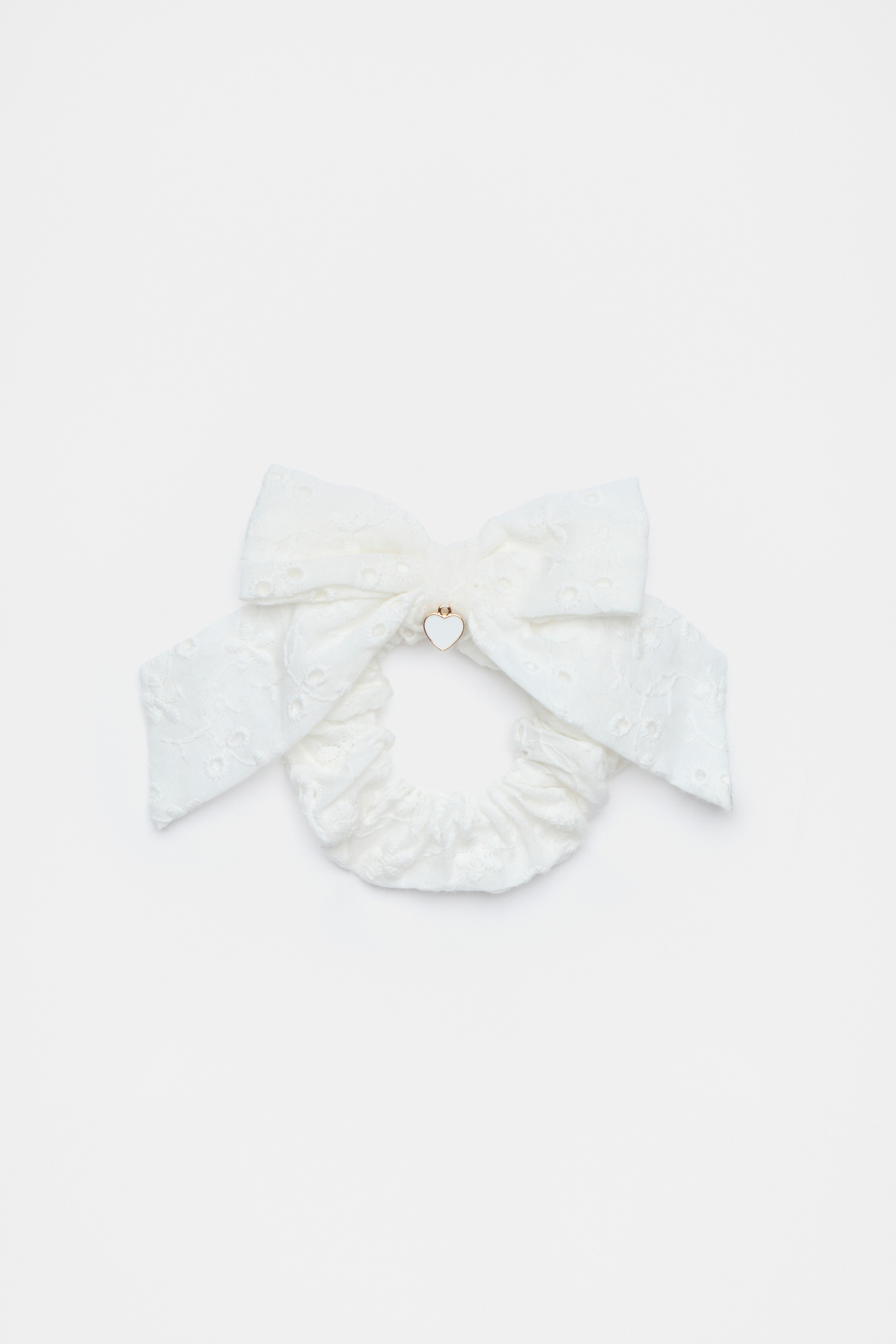 Sweetened with a broderie bow and a small charm, this scrunchie is the cute style to complete her look. This product is not a toy and is not suitable for children three years and under.