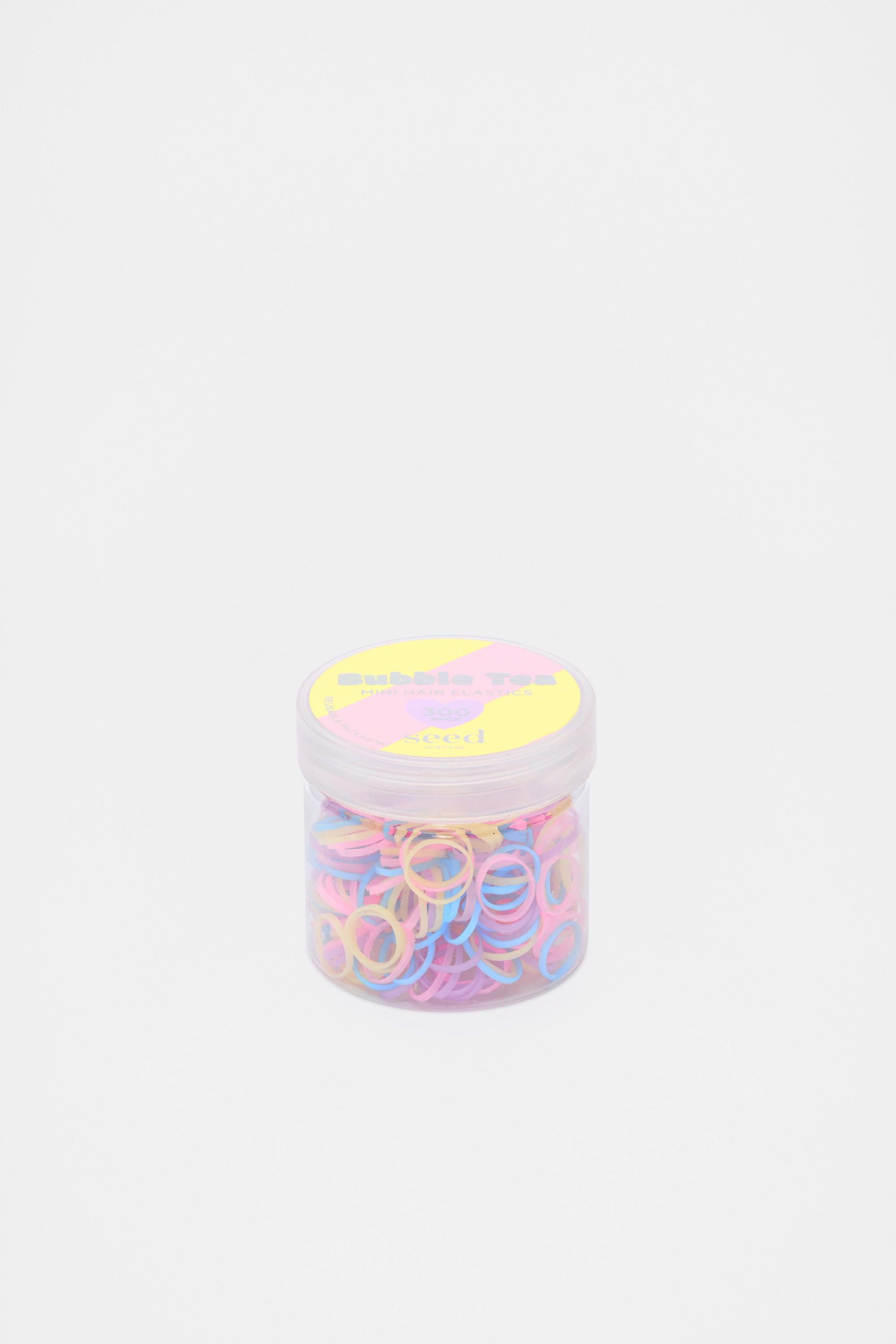 These mini hair elastics are an everyday essential, coming in a range of colours with a cute bubble tea design on their reusable tub. This product is not a toy and is not suitable for children three years and under.