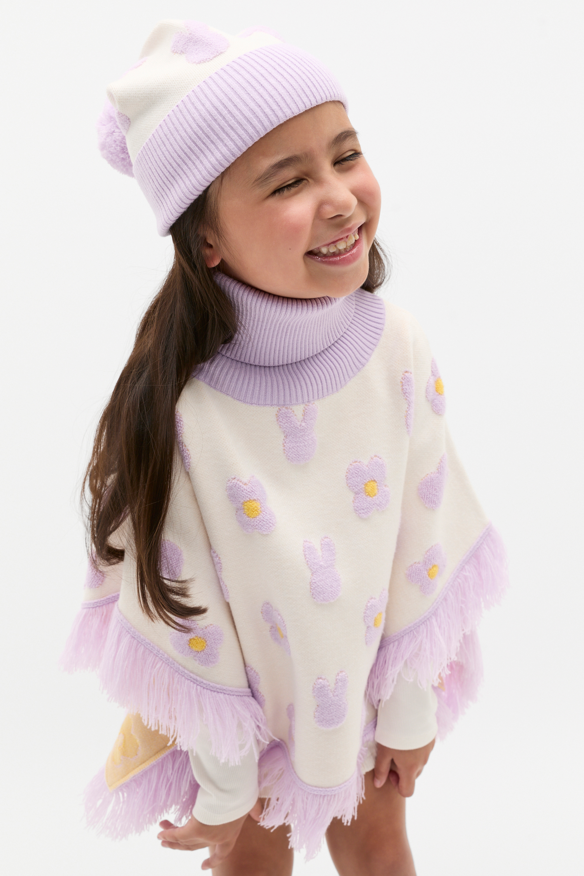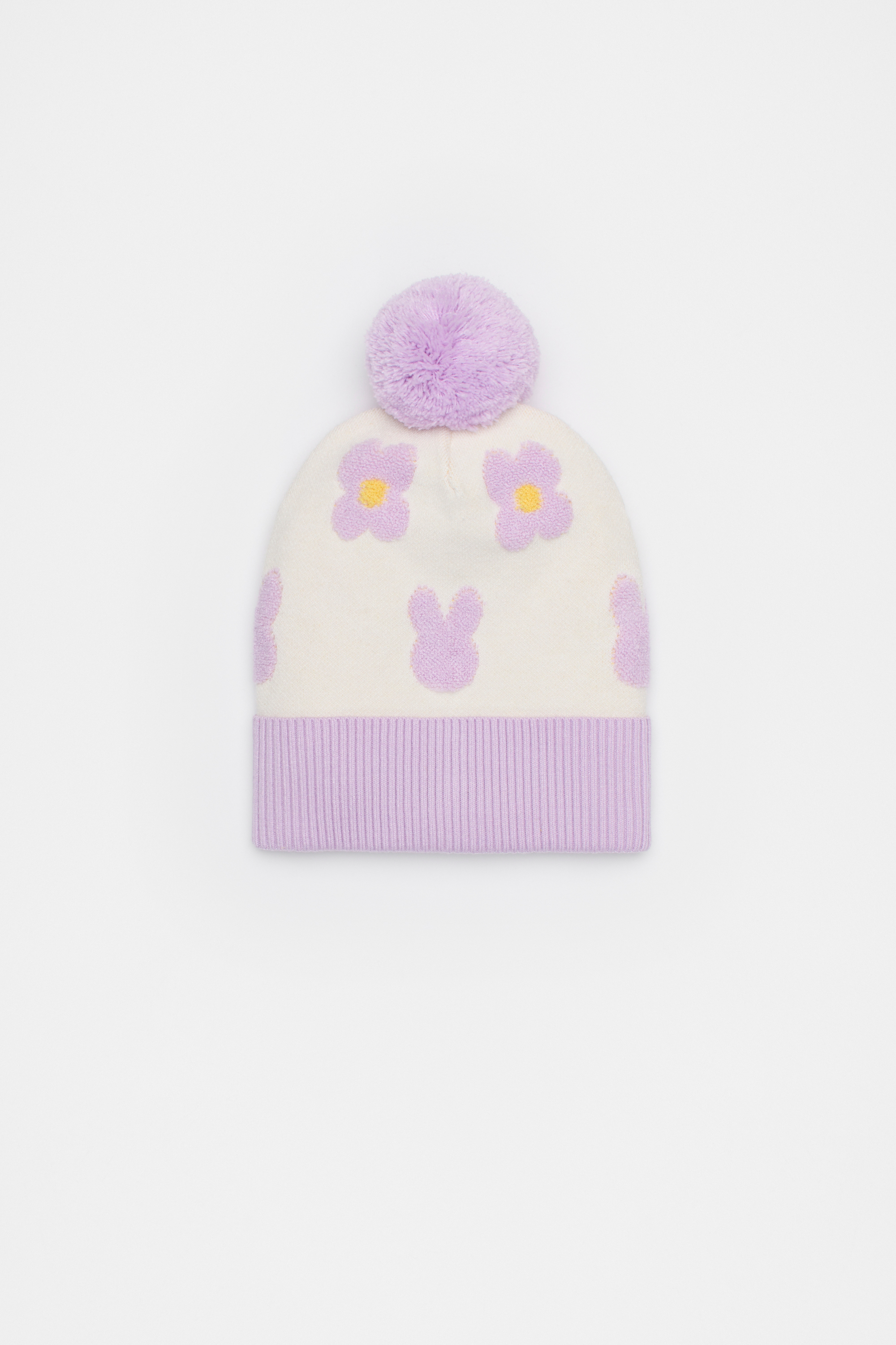 Cosy and sweet, this beanie is perfect for the cooler weather. It features an all-over bunny and flower design and a fluffy pom pom. For an adorable matching set, pair with the bunny poncho, mittens or ear muffs.