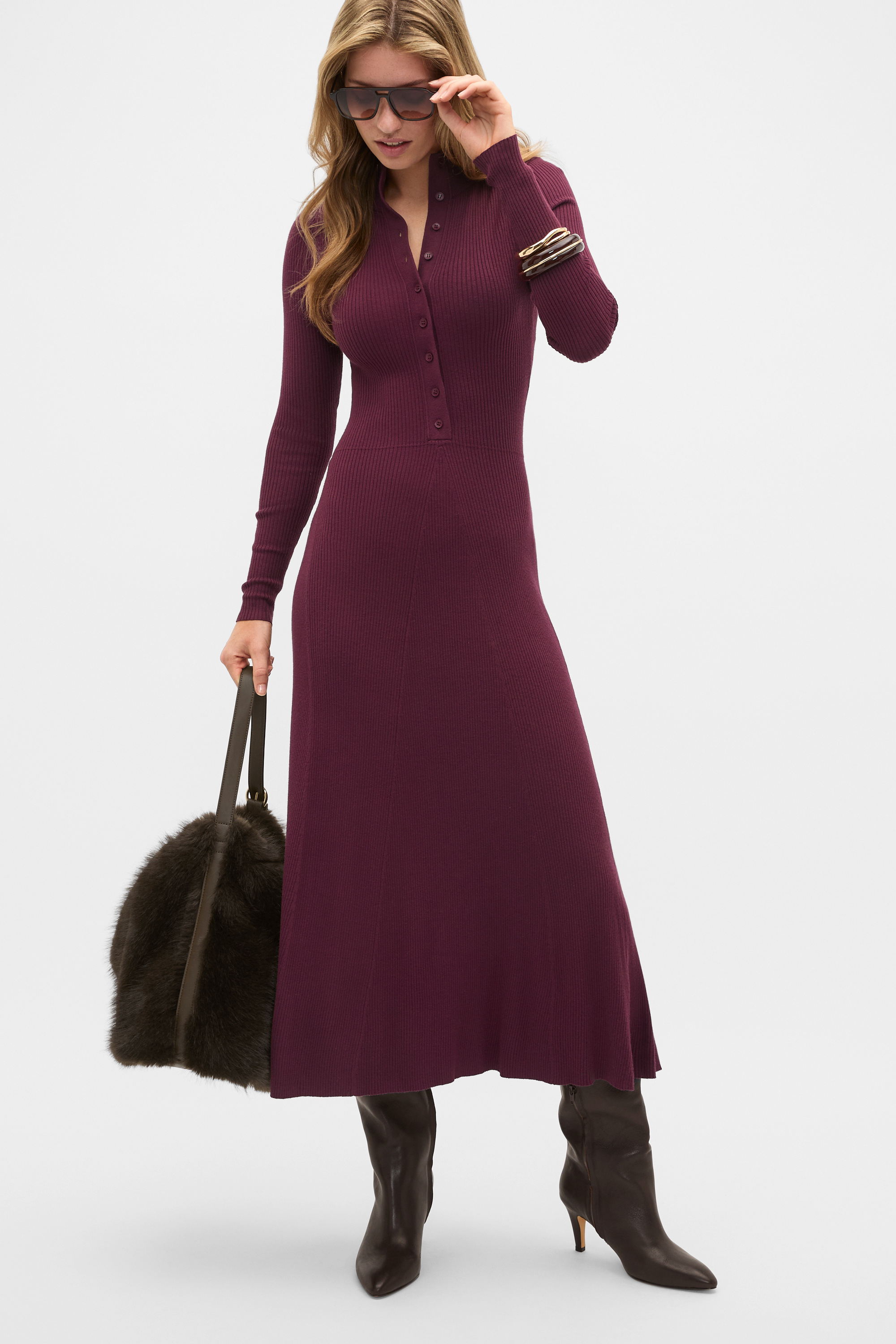Elegant and refined, this knit dress brings feminine styling to your winter wardrobe. Crafted in a viscose blend in a stretch knit, it features a mock neck with a button down detail, long sleeves and a sleekly fitted silhouette. It falls to a midi length and is perfect to pair with boots through the shifting seasons.