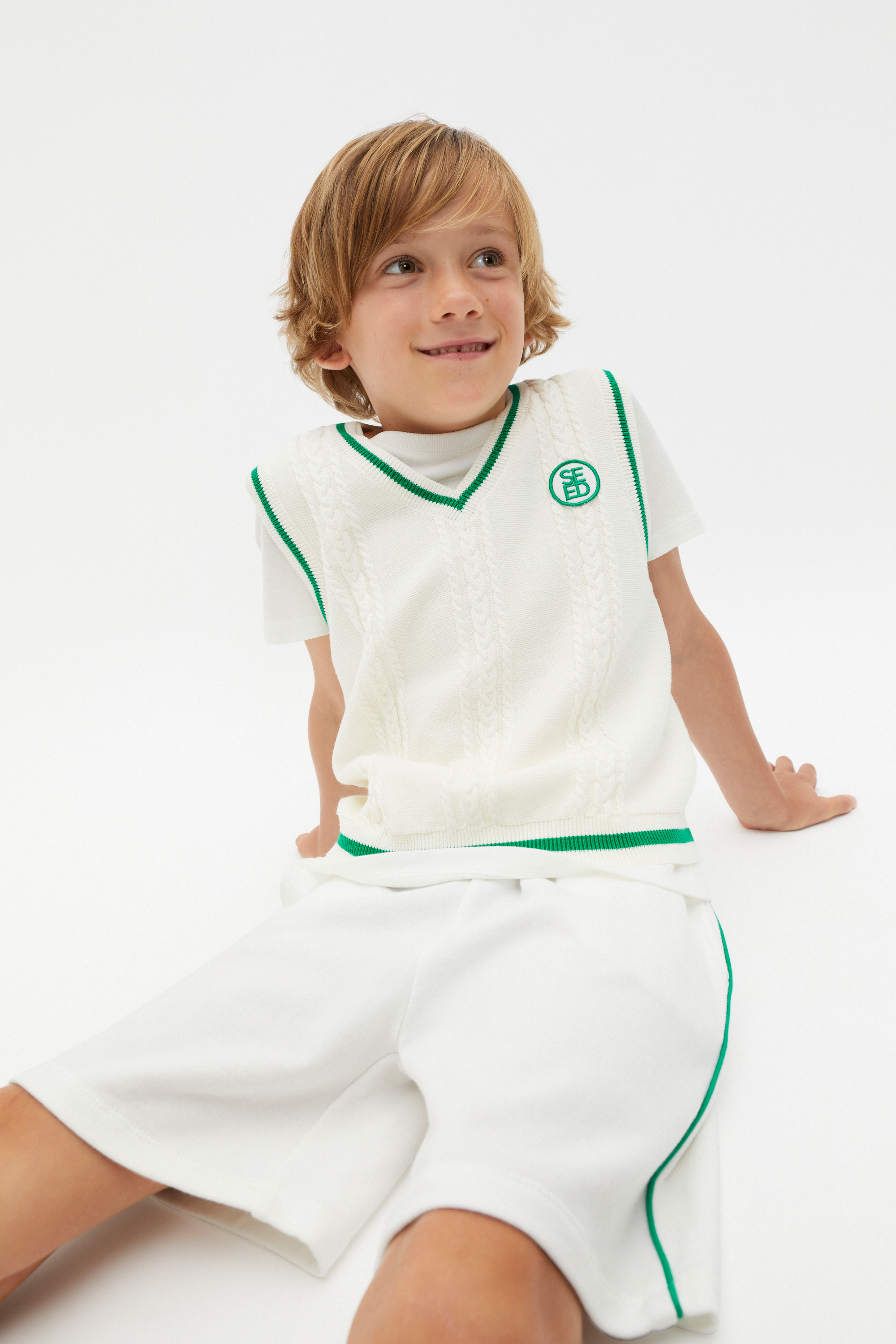 Sporty and cool, this vest is a timeless classic. Crafted in a premium cotton, it's a cable knit with ribbed trims and contrast stripe details. It features a V neck and an embroidered Seed logo patch. Style with a tennis short for a winning ensemble.