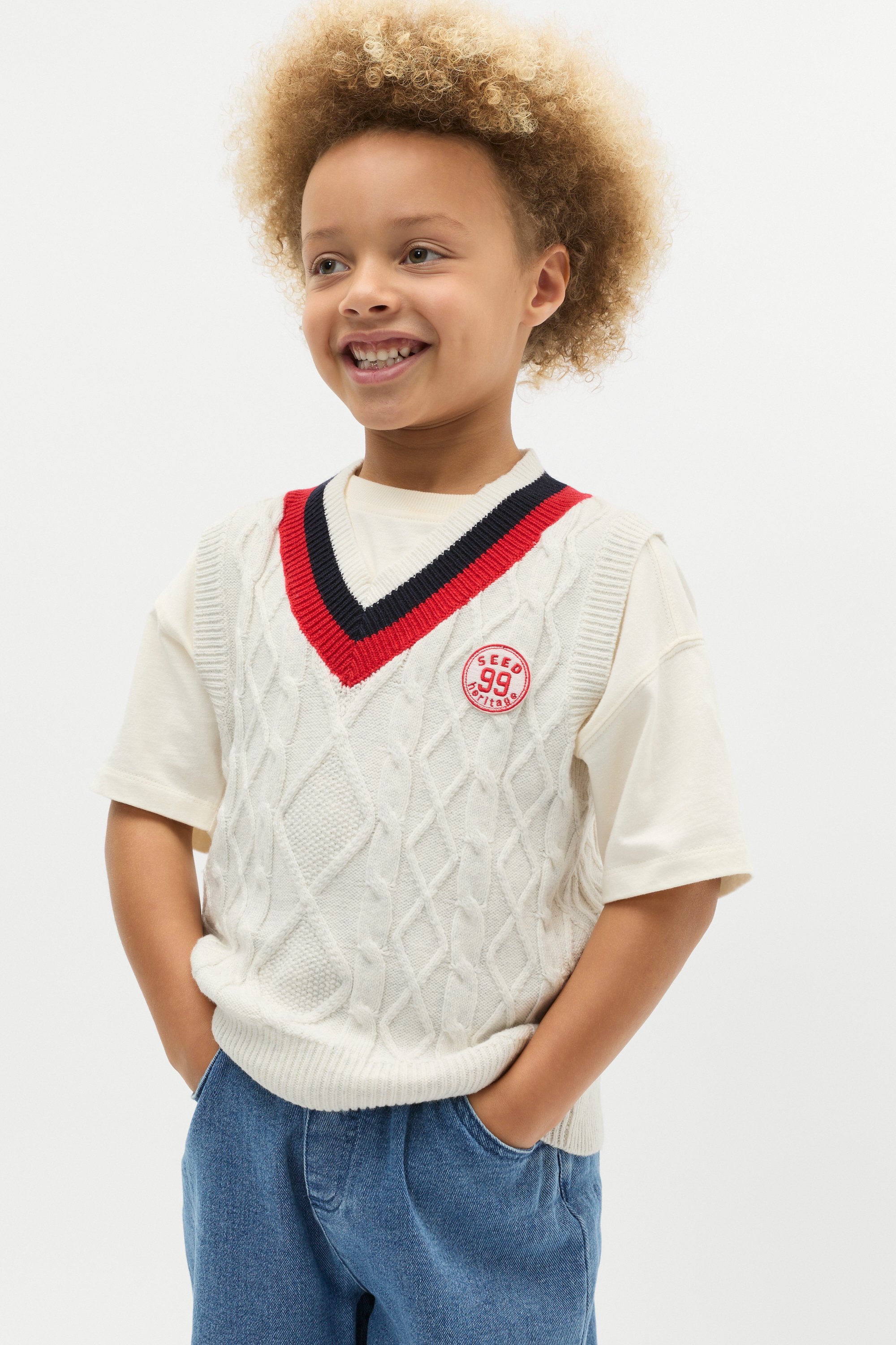 Add a sporting finish to his outfits with this classic cable-knit vest, the ideal winter layer. Crafted in a soft blend, it features a V-neck, a sleeveless shape and ribbed trims. It also has an embroidered Seed Heritage logo patch and a stripe detail at the neck line.