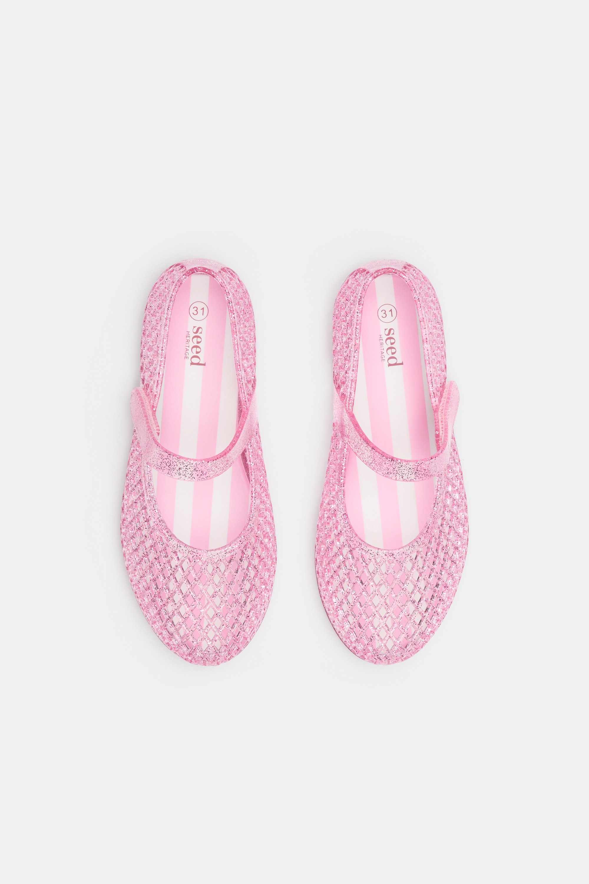 A new take on a classic style, these jelly ballets feature a caged design with a glittery finish. These splash-proof ballet flats are versatile for every summer outing. They secure with a hook-and-loop strap for ease.