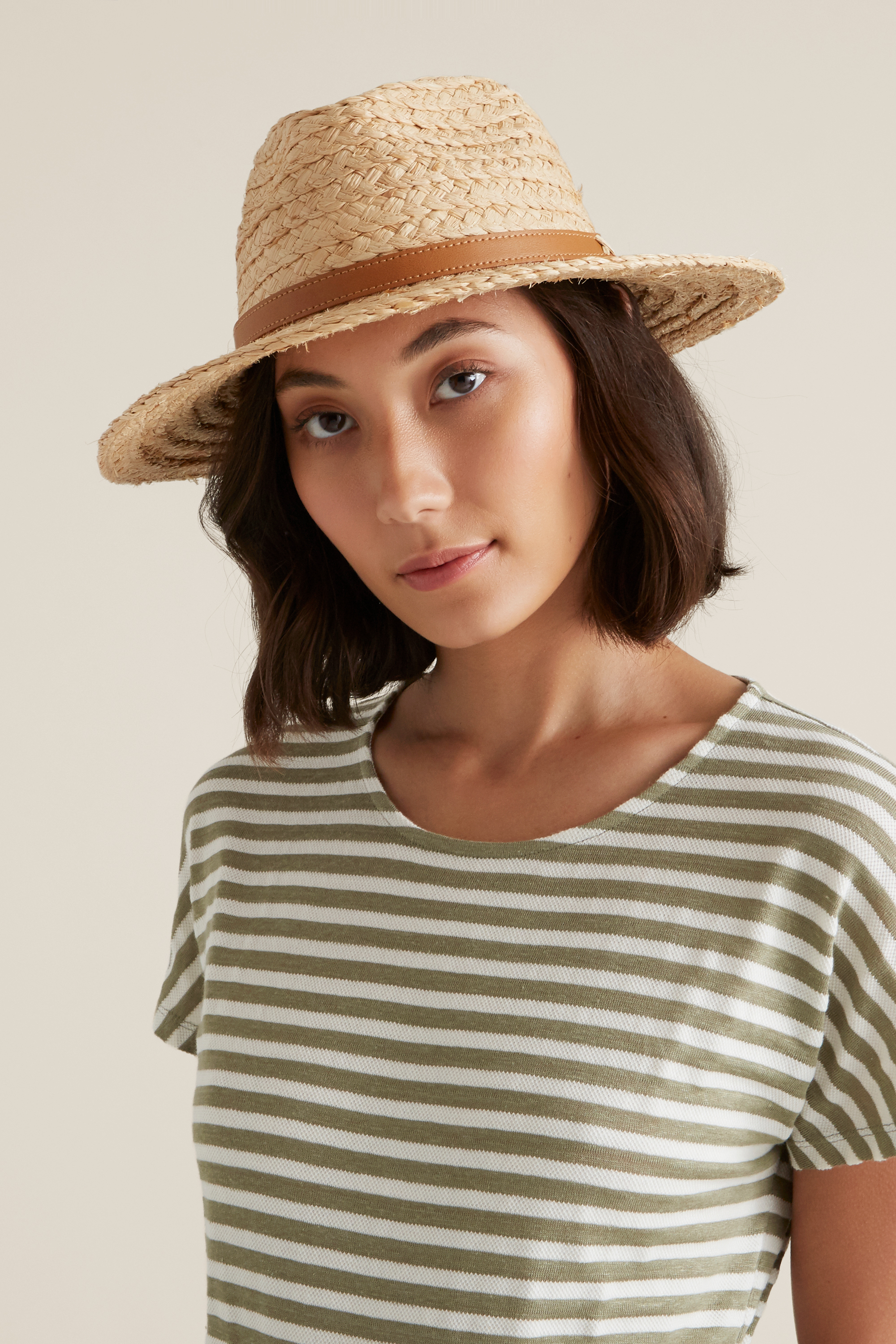 Structured and sleek, this Casual Panama is sure to elevate your off-duty look. Crafted from a raffia fabrication, this Panama detailed with a tanned band around it's base for added interest. For care instructions, please refer to the care label inside of the garment.