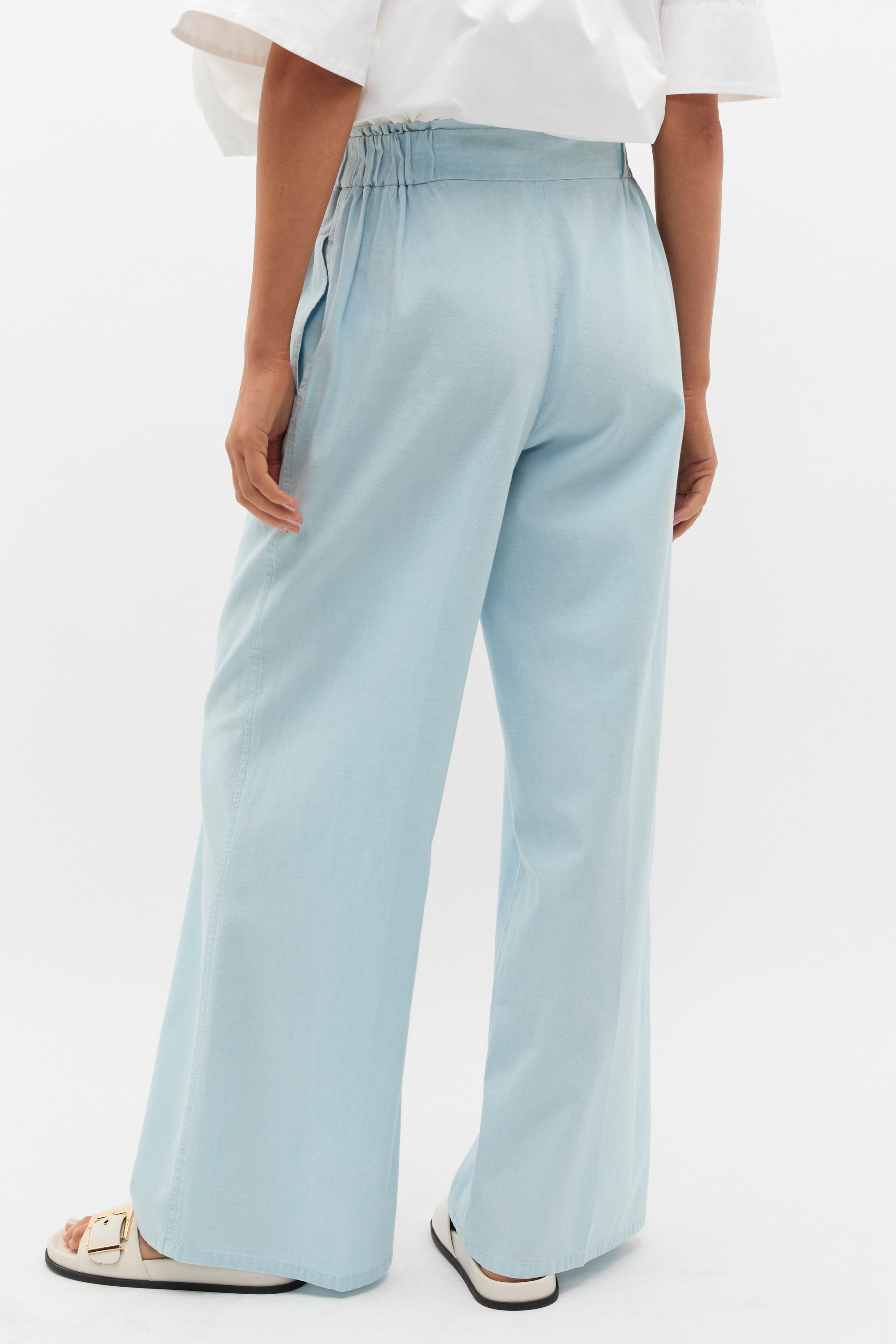 With a comfortable elasticated waistband, these versatile chambray pants are set to be your new go-to for instant summer style. Crafted in premium cotton, they feature gathered details, a high waisted cut and wide leg shape.