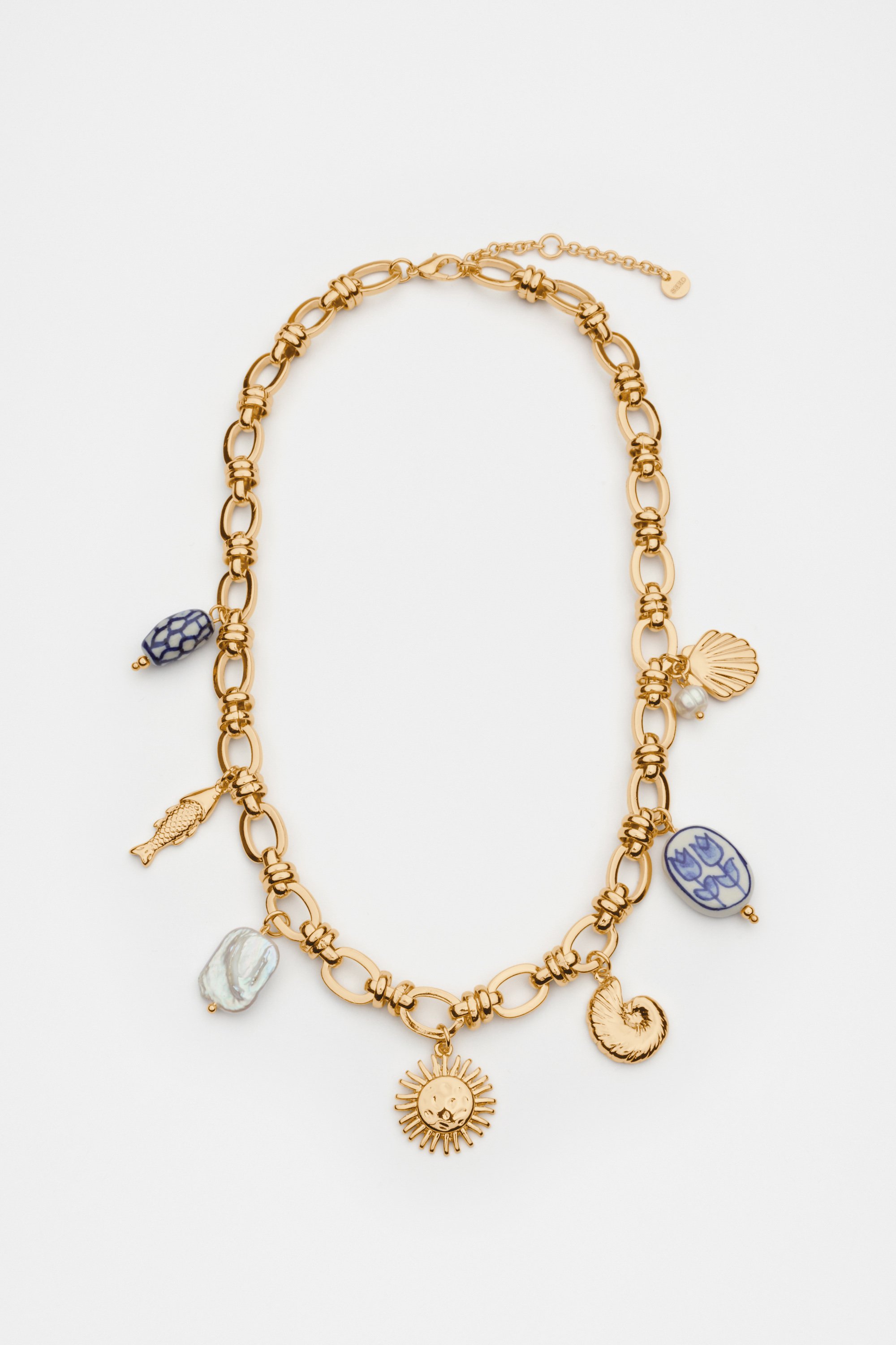 This elegant necklace makes the perfect gift. It features a chunky chain with a bespoke selection of charms including a freshwater pearl. Includes an extender chain.