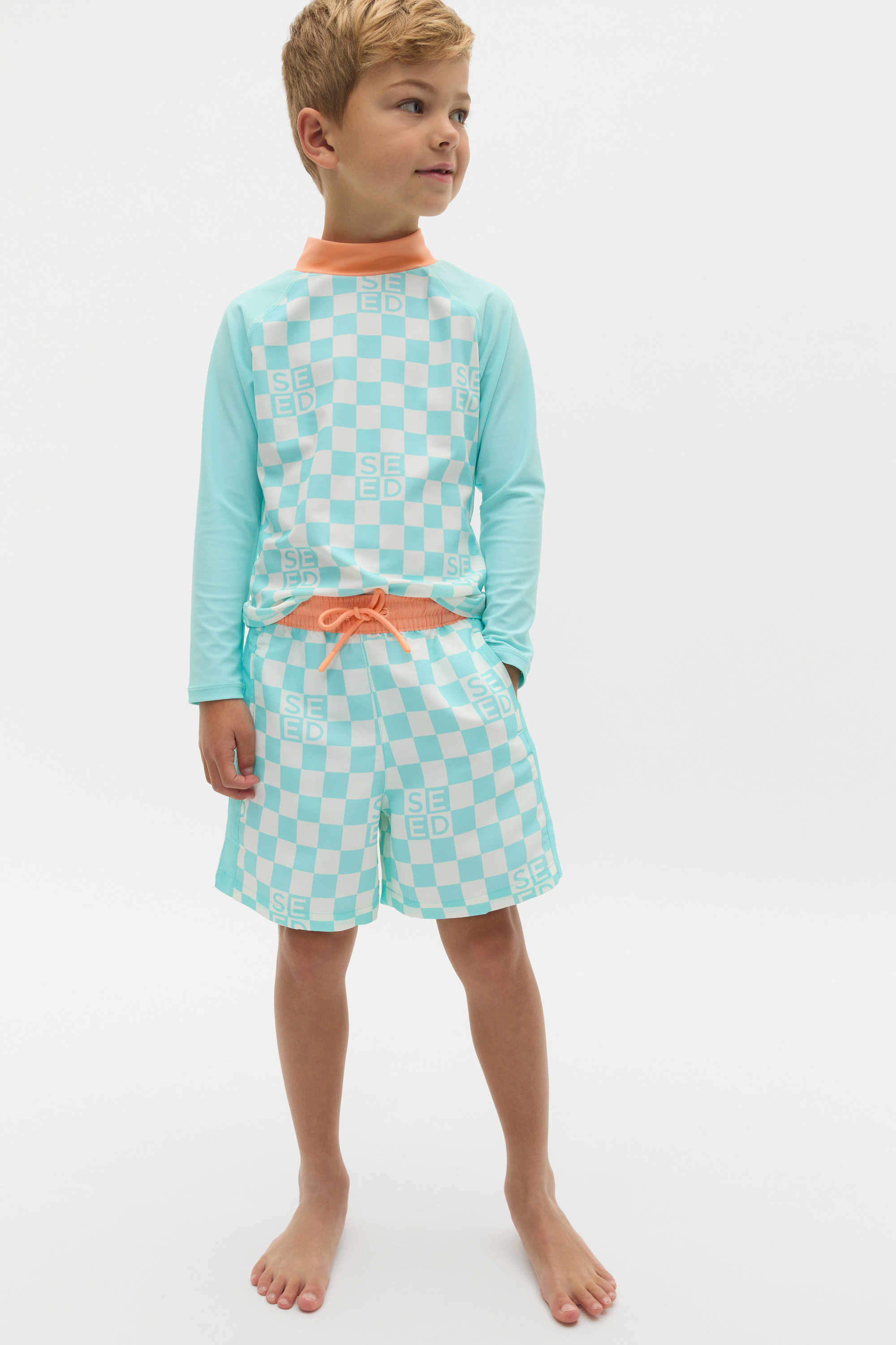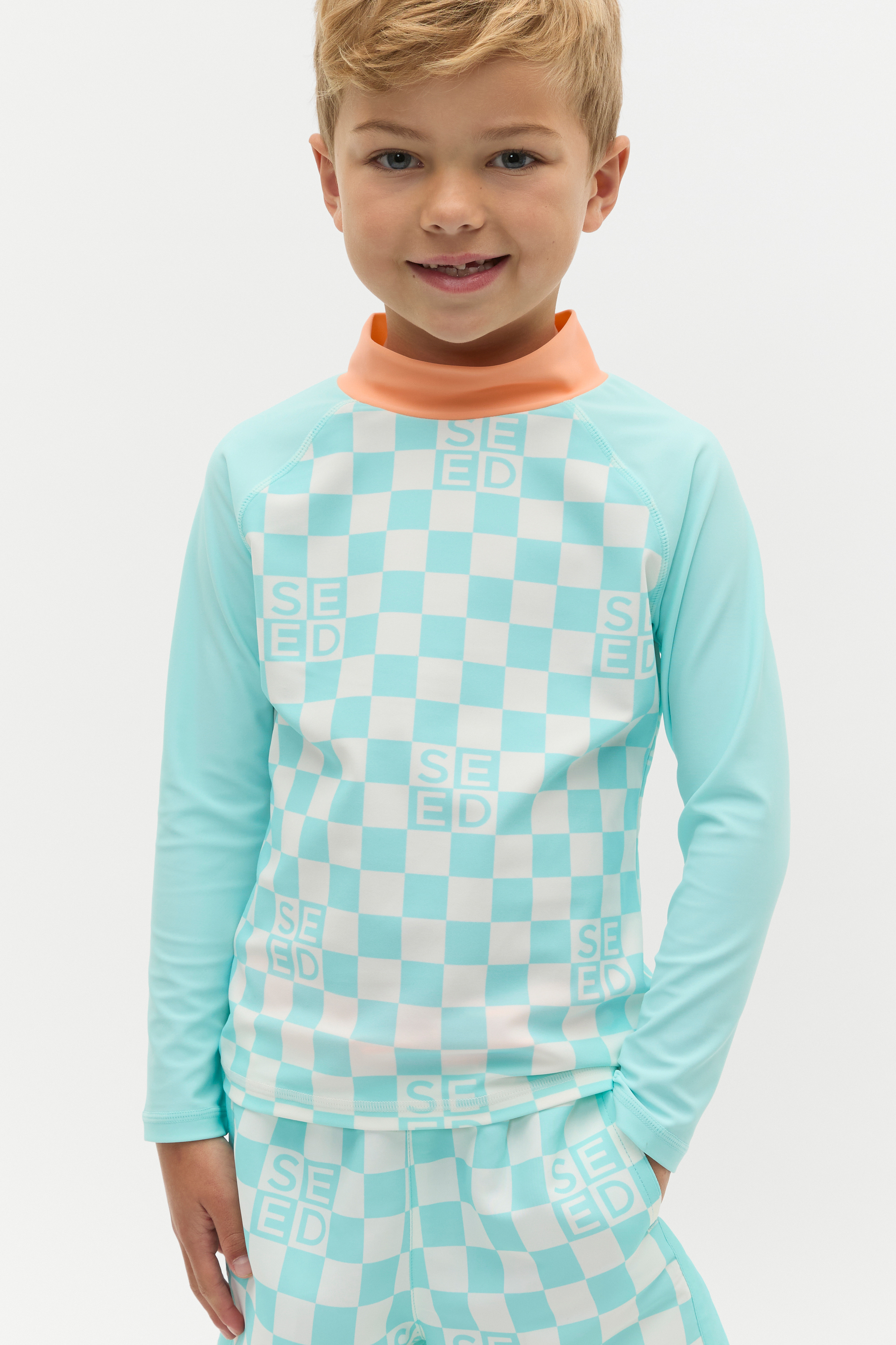Ready for his swim-day adventures, this rash suit is the cutest option finished in a colourblock check design. Easy to wear and play in, it features a round neck and long raglan sleeves. Style with the matching boardshorts for the sweetest sunny-day set.
