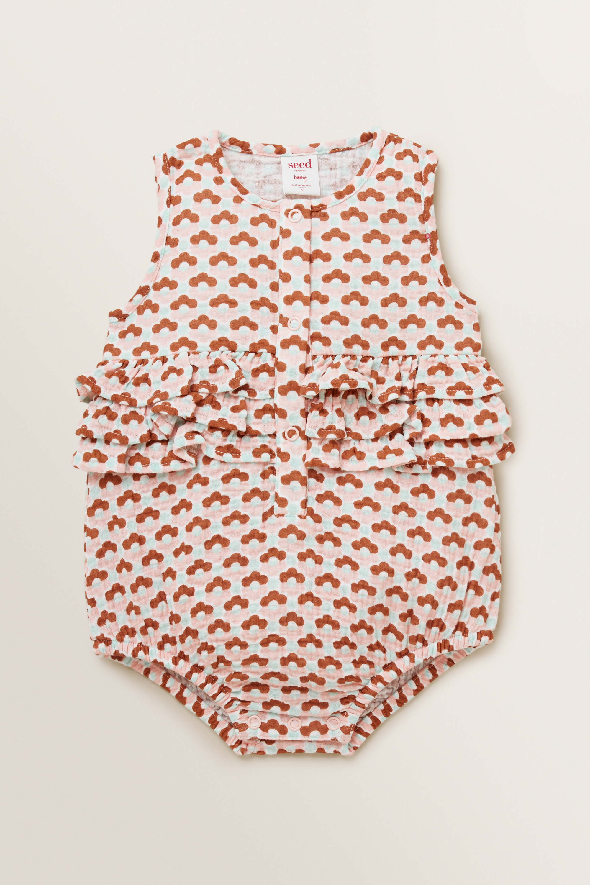 This Cheesecloth Floral Onesie is made from a 100% cotton fabrication, this onesie features a round neckline, shoulder straps, frilled waist, button front closure and cuffed bloomer shorts.