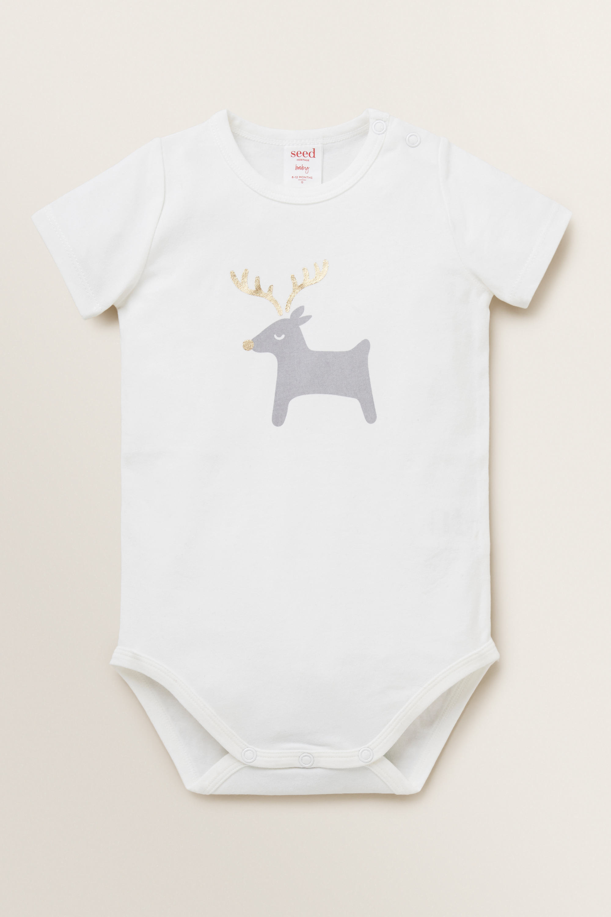 Accented with a metallic print placement, this Christmas Reindeer Bodysuit features a crew neckline, short sleeves, shoulder snaps and press-stud gusset closure for easy changes.