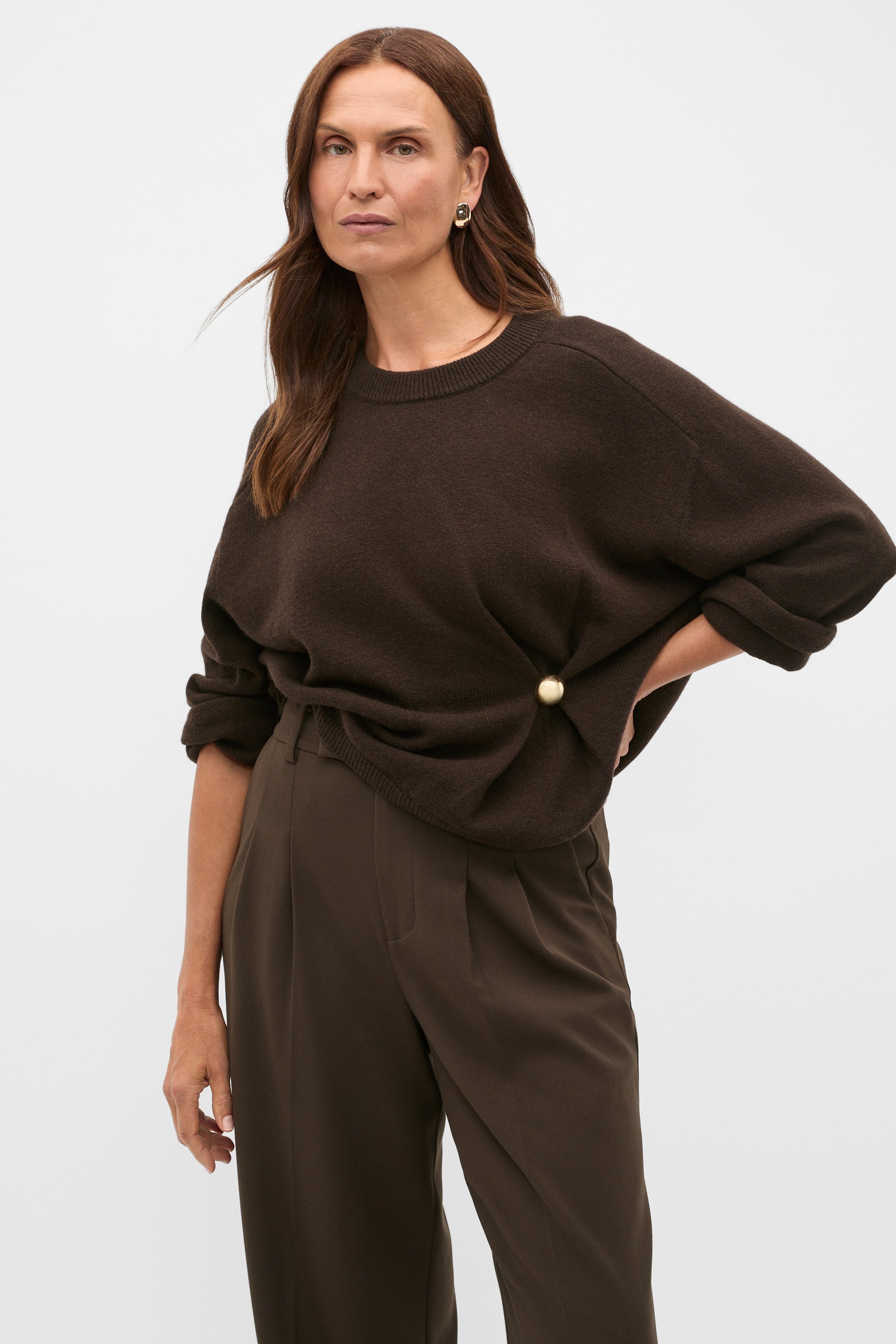 With a gathered clasp detail, this knit is an elevated option for your mid-season casual wardrobe. It features a round neck, a drop shoulder with long sleeves and a relaxed fit through the body. Dress up with a satin skirt or pair with jeans for an easy everyday look.