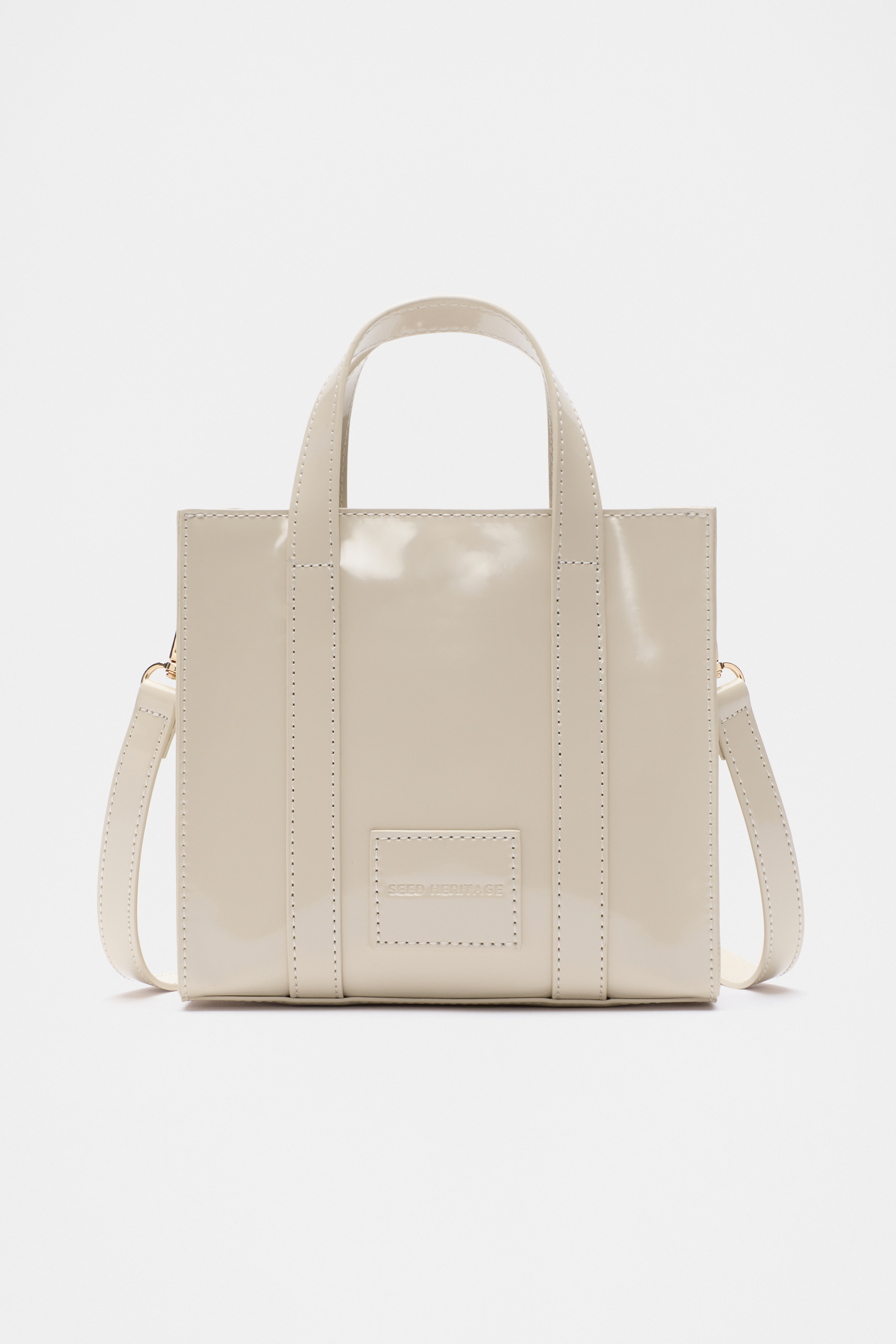 A miniature take on a classic design, this tote bag has a high shine finish for a luxurious look. It features short carry handles as well as a detachable crossbody strap. It's a fully lined styled and features an internal zip pocket and a Seed Heritage logo.