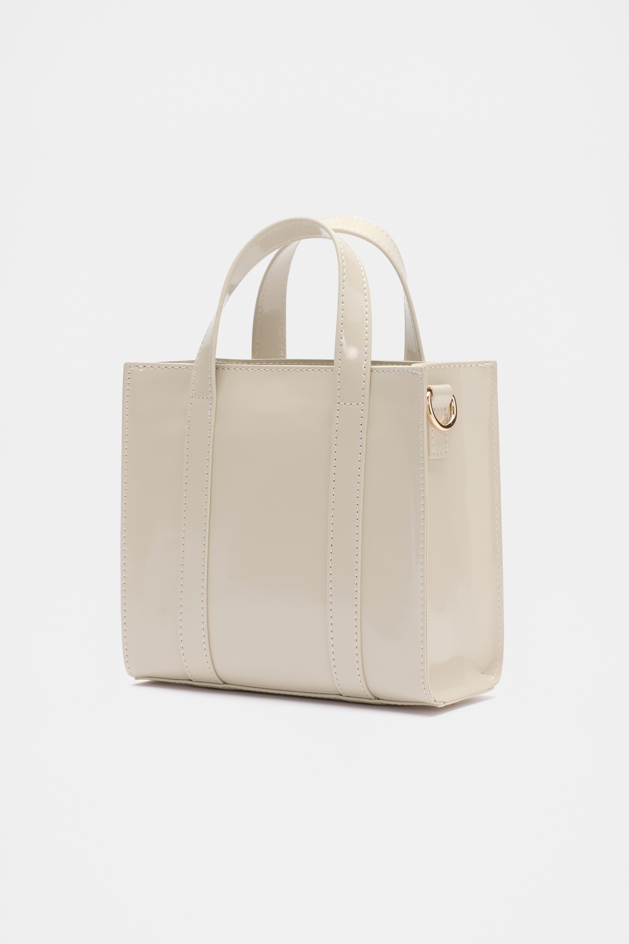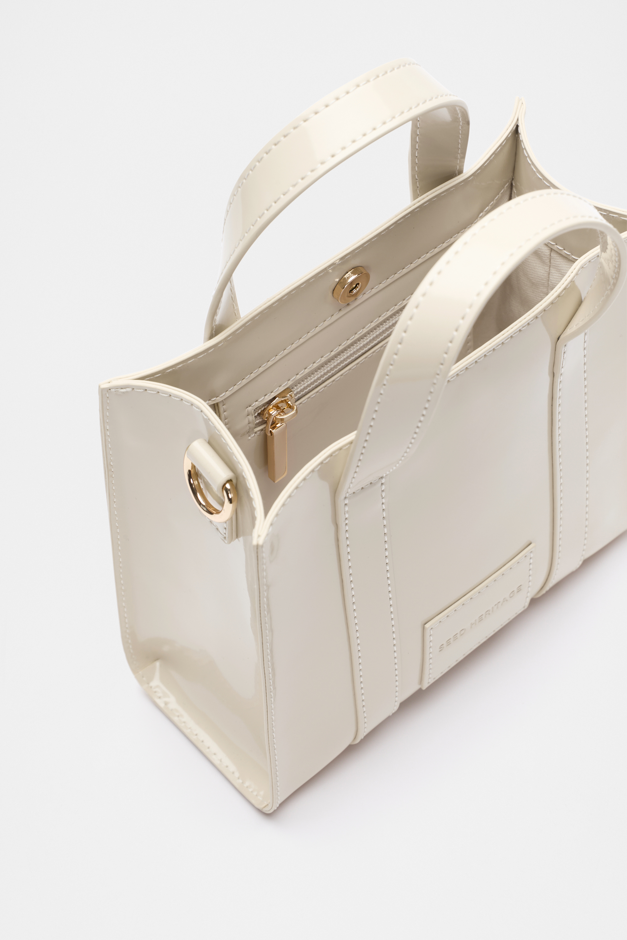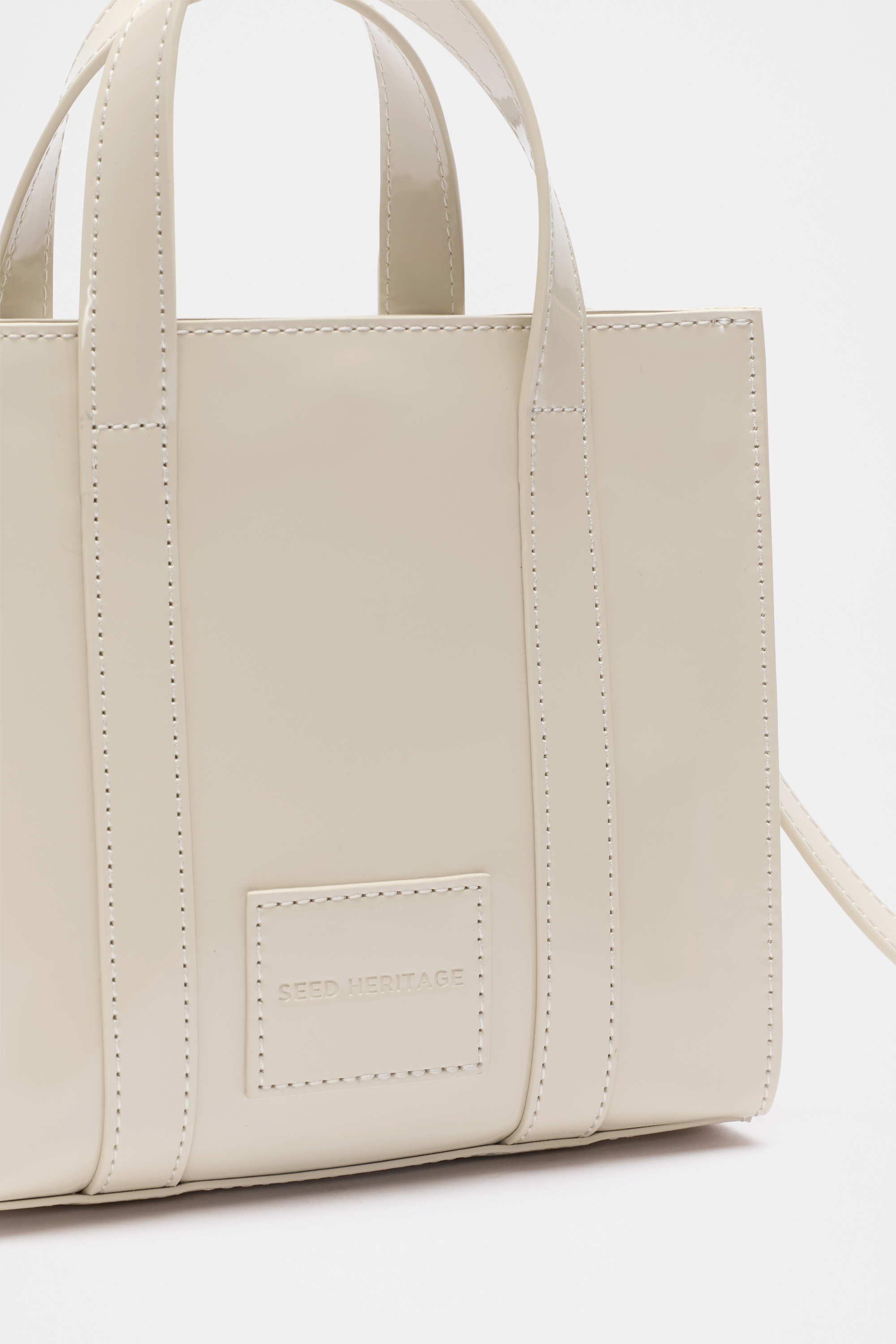 A miniature take on a classic design, this tote bag has a high shine finish for a luxurious look. It features short carry handles as well as a detachable crossbody strap. It's a fully lined styled and features an internal zip pocket and a Seed Heritage logo.