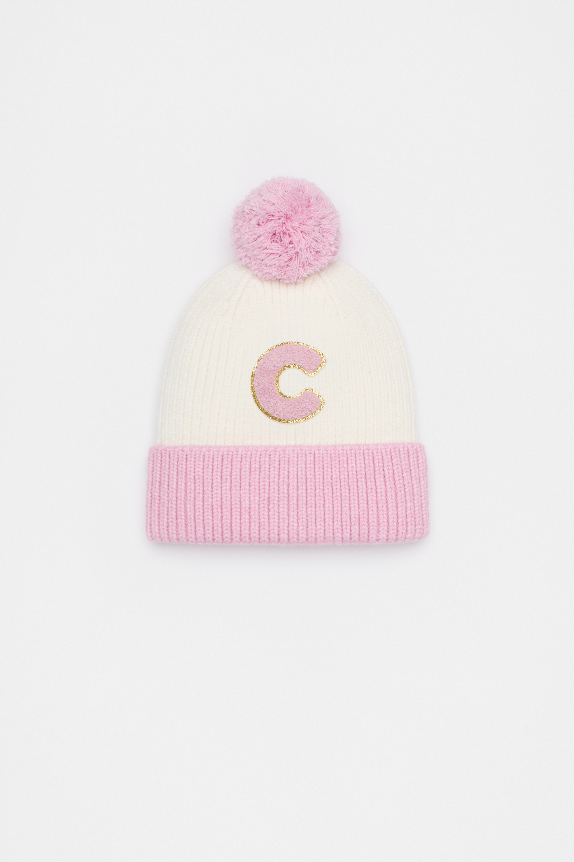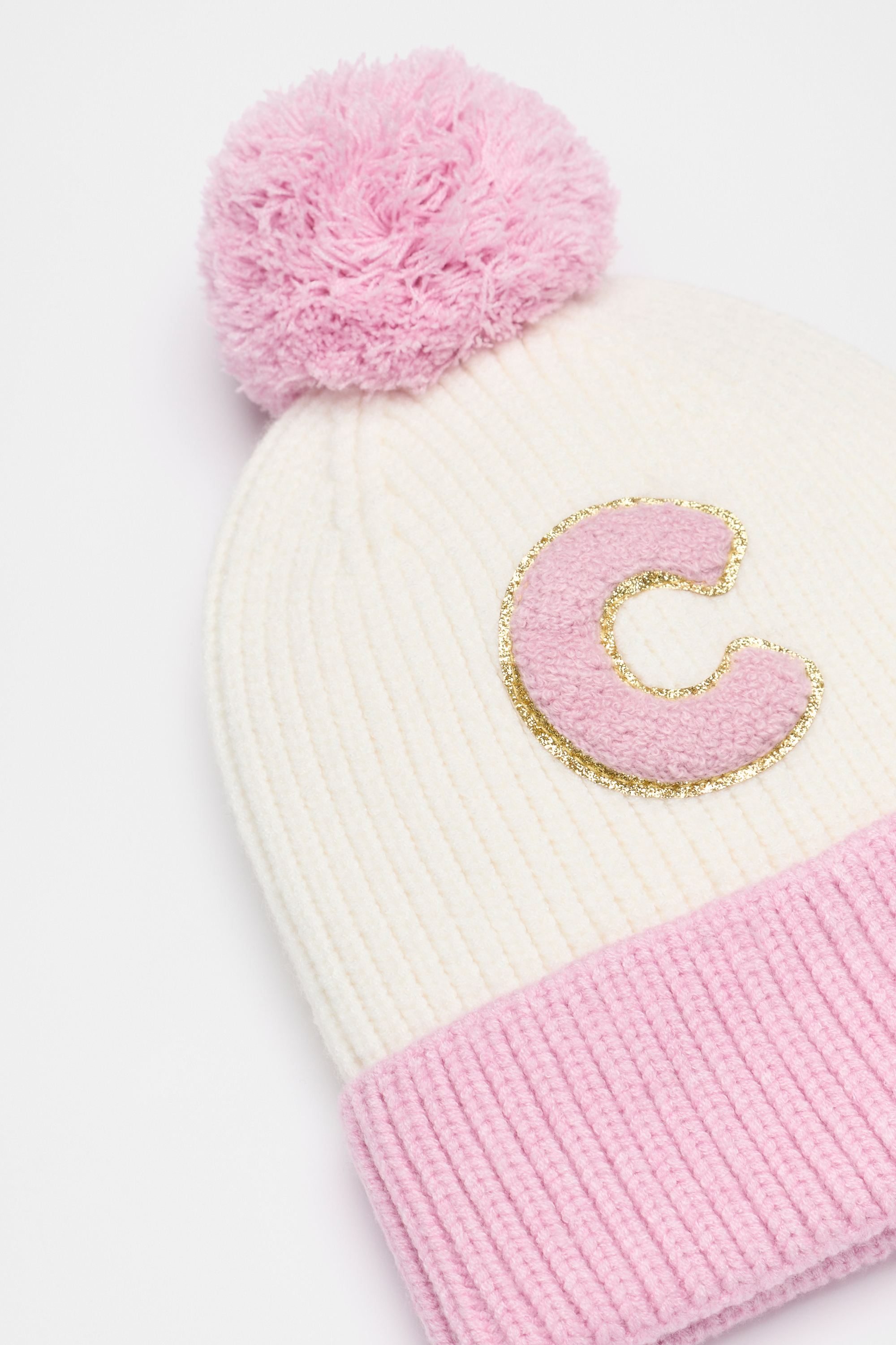 This adorable beanie has a ribbed hem for a comfortable fit. Featuring a cute pom pom, the contrast initial motif finished in gold glitter adds a personalised touch.