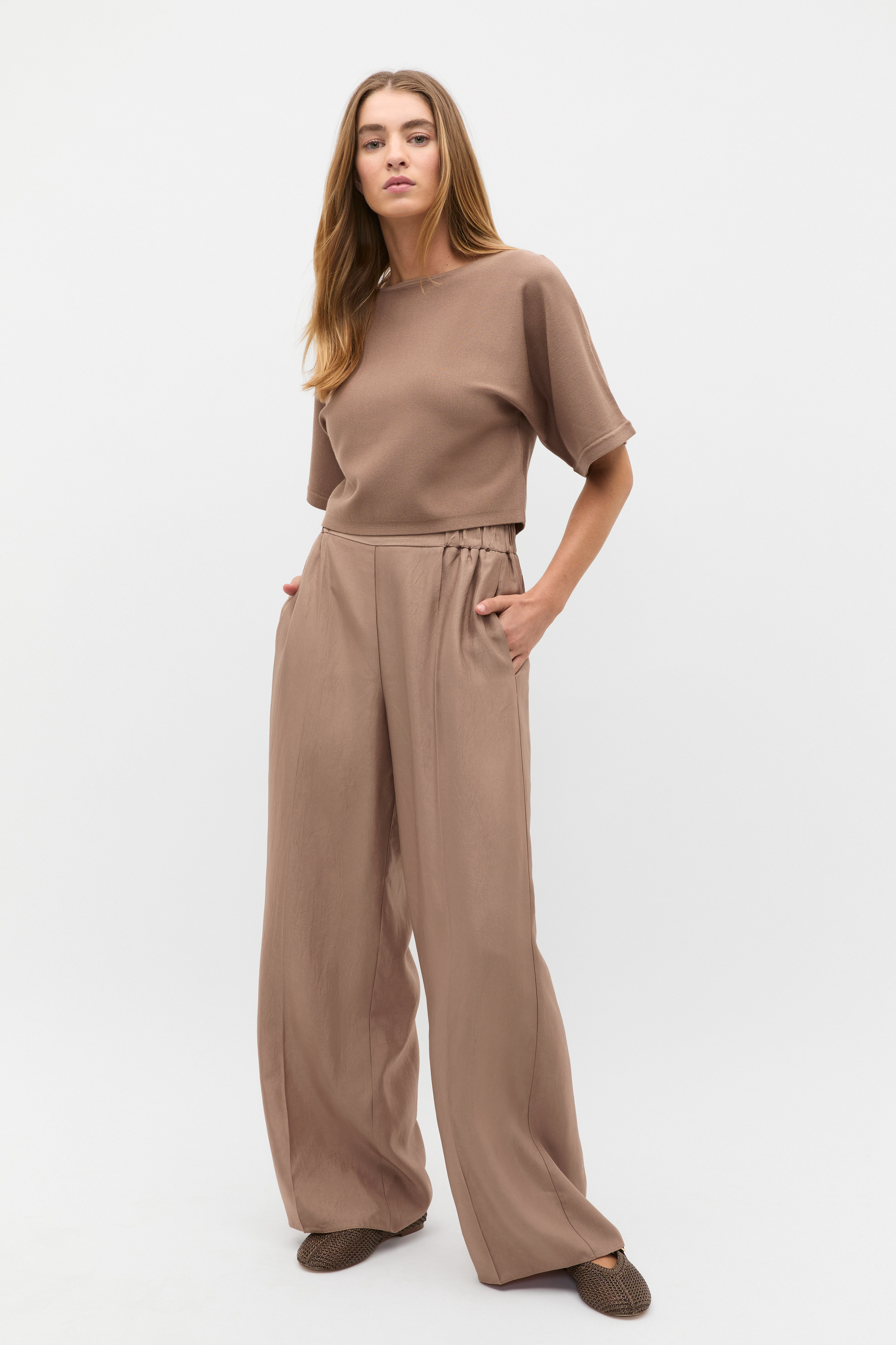 This crepe knit top adds elegance to your day-to-day styling, perfect for your workwear looks. It features a round neck design, short sleeves and a boxy fit.