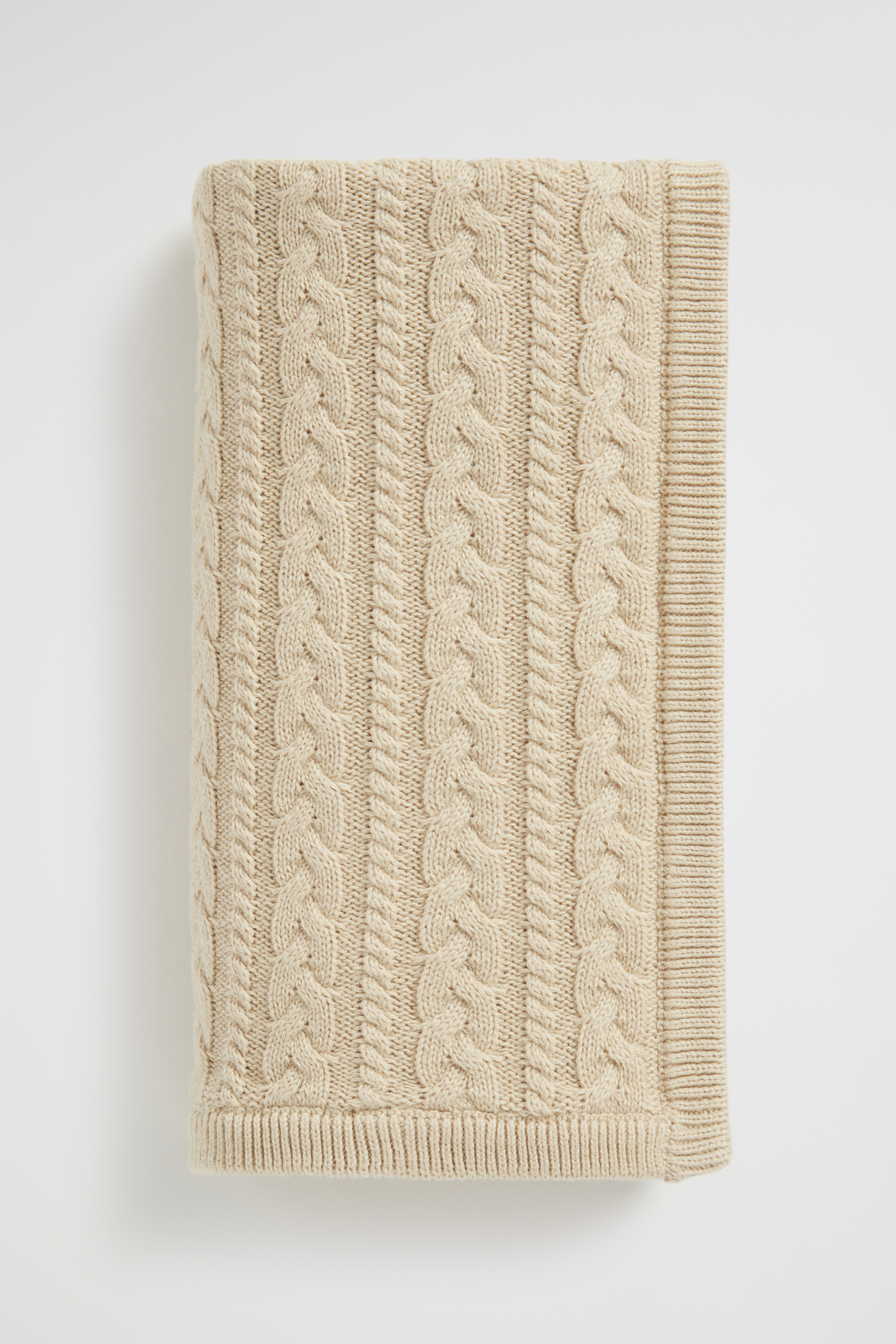 Knitted from a soft cotton and wool blend, this blanket is a must-have for any newborn, and is perfect for gifting. The blanket is cable knitted with ribbed trims.