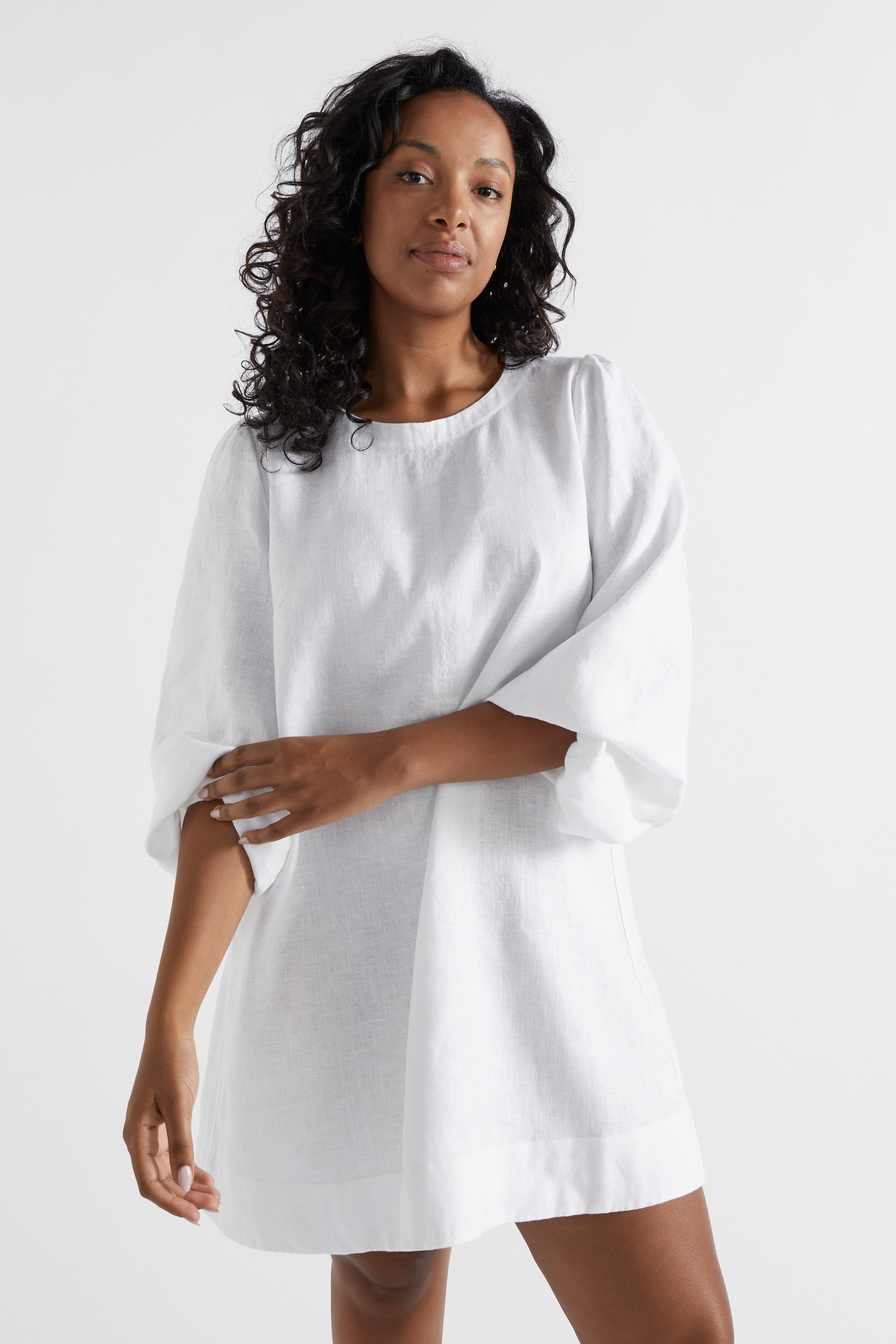 Crafted from premium linen crafted from French flax, this mini is bound to be your next go-to. It features a round neck with a keyhole opening and buttons at the back, and long puff sleeves with gathers at the cuffs.