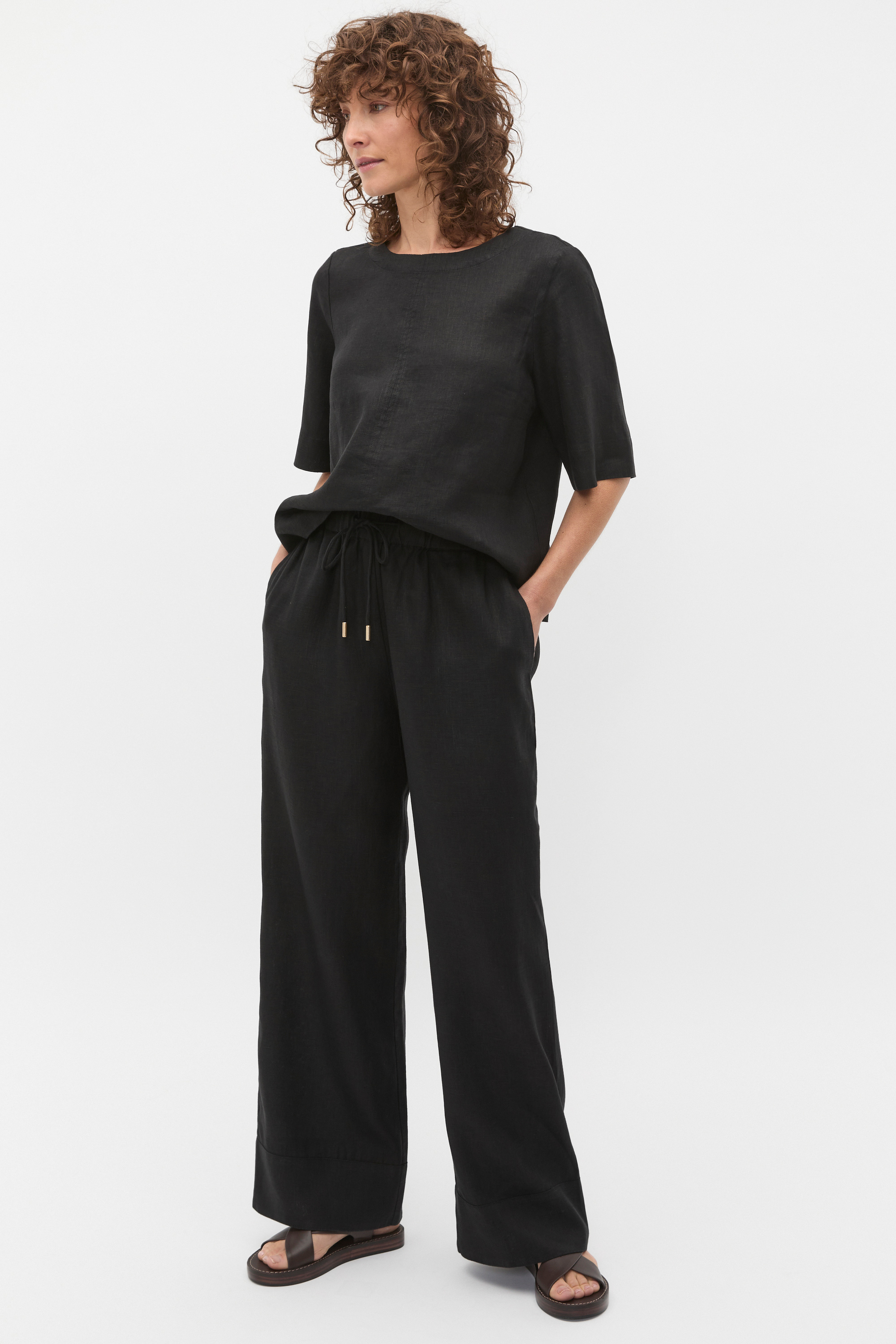 A premium essential in your everyday wardrobe, this tee is crafted in pure linen for an effortlessly elevated look. It features a round neck, short sleeves, a relaxed fit and secures with a button at the back of the neck. Style with the coordinating linen pieces for a chic tonal set, or pair with your favourite jeans for your day-to-day casual.