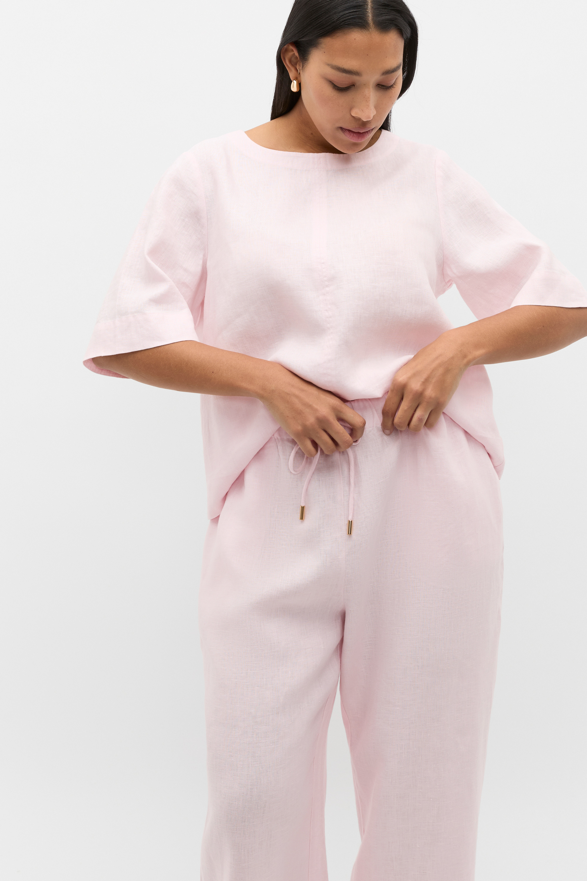 A premium essential in your everyday wardrobe, this tee is crafted in pure linen for an effortlessly elevated look. It features a round neck, short sleeves, a relaxed fit and secures with a button at the back of the neck. Style with the coordinating linen pieces for a chic tonal set, or pair with your favourite jeans for your day-to-day casual.