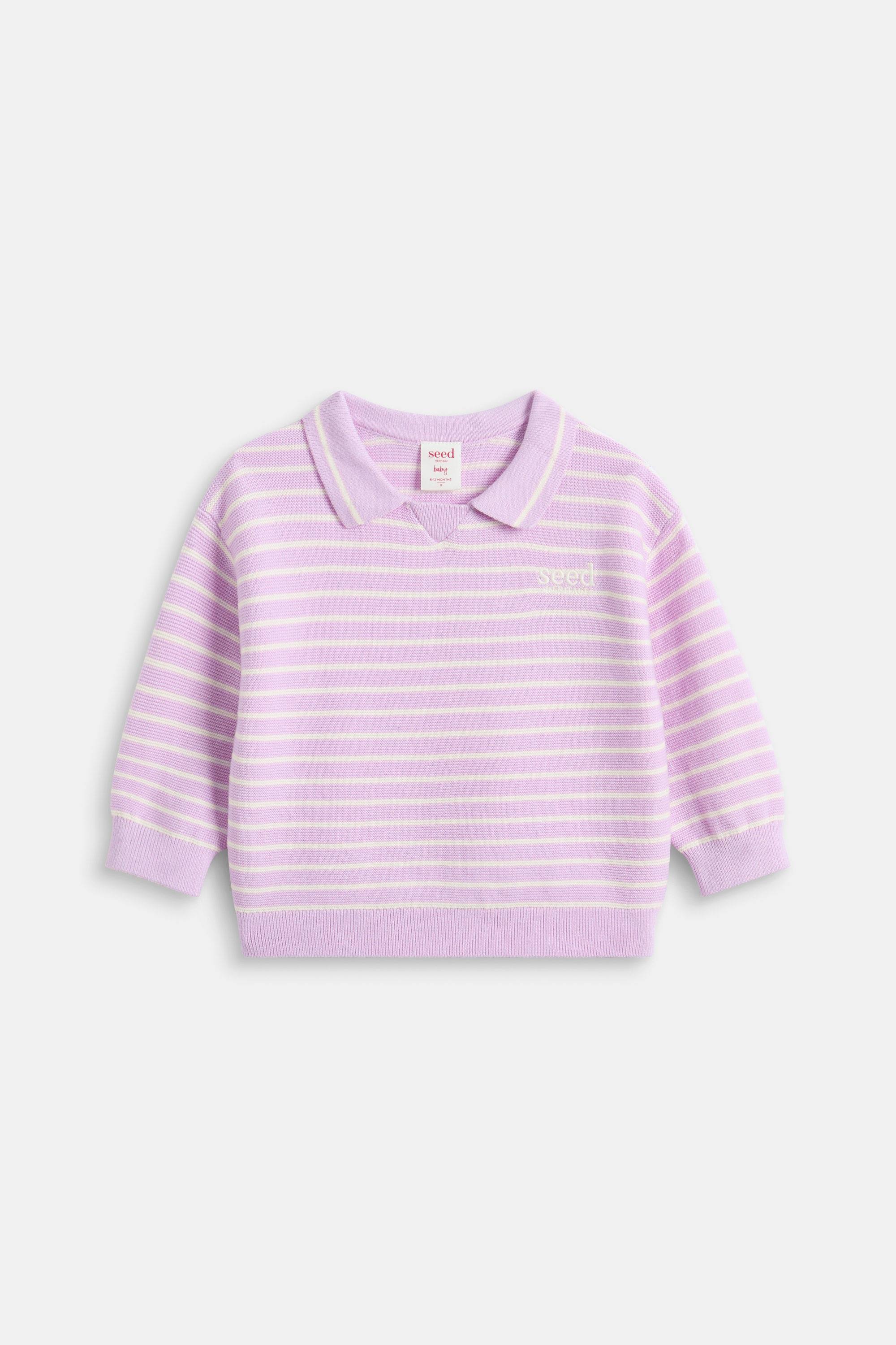 Pretty with a pink stripe design, this smart little sweater is practical and sweet. Crafted in premium cotton with a soft knit finish, it features an open collar, long sleeves with ribbed trims and an embroidered Seed Heritage logo.