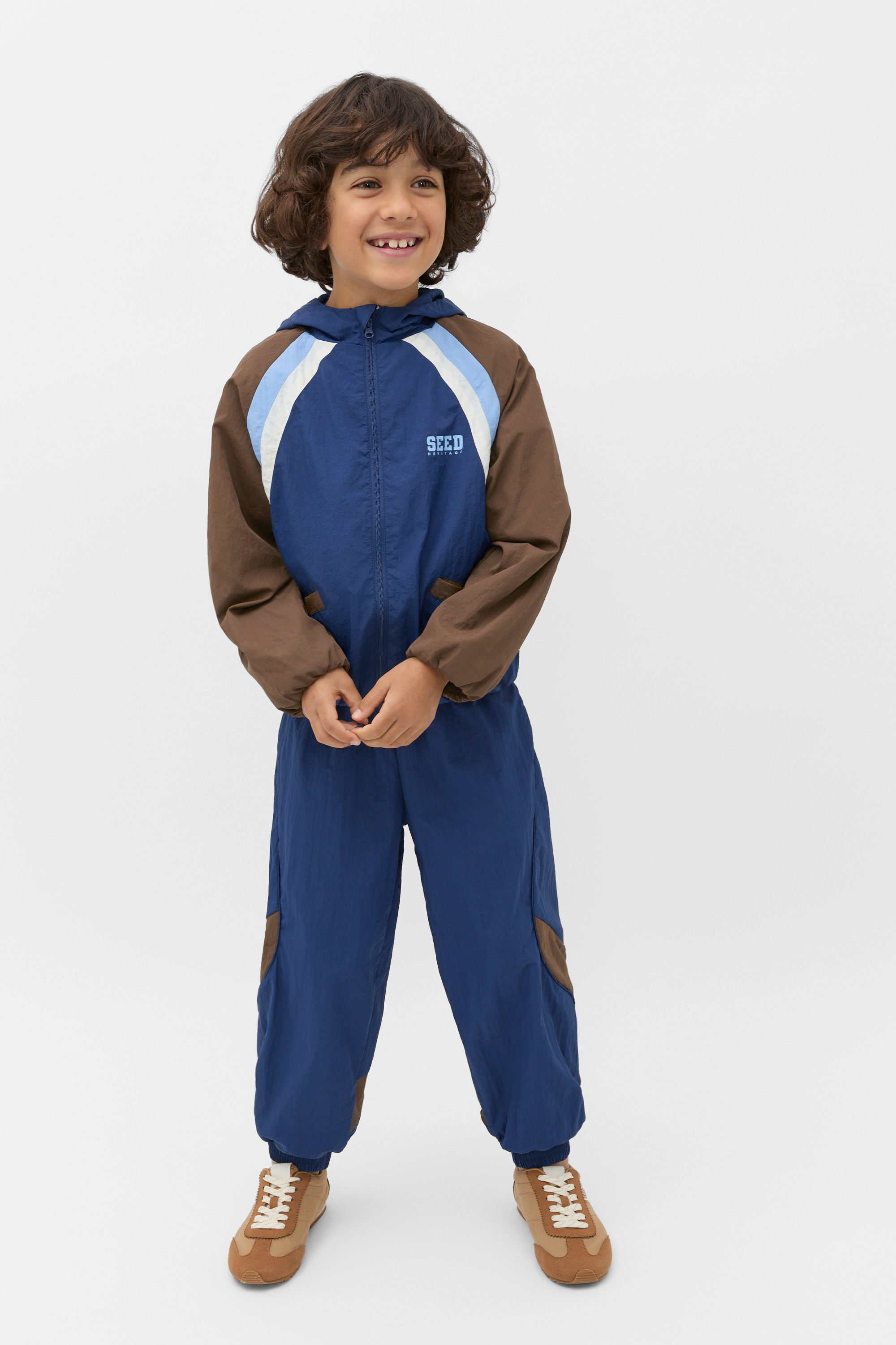 A trending style with a retro feel, this spray jacket was made for days at play and is handy for outdoor adventures. It features a hood, a zip-through front, long sleeves, pockets, elasticated trims and a colour spliced design. It also features a Seed Heritage logo. Style with the matching spliced pants for the cutest head-to-toe set.