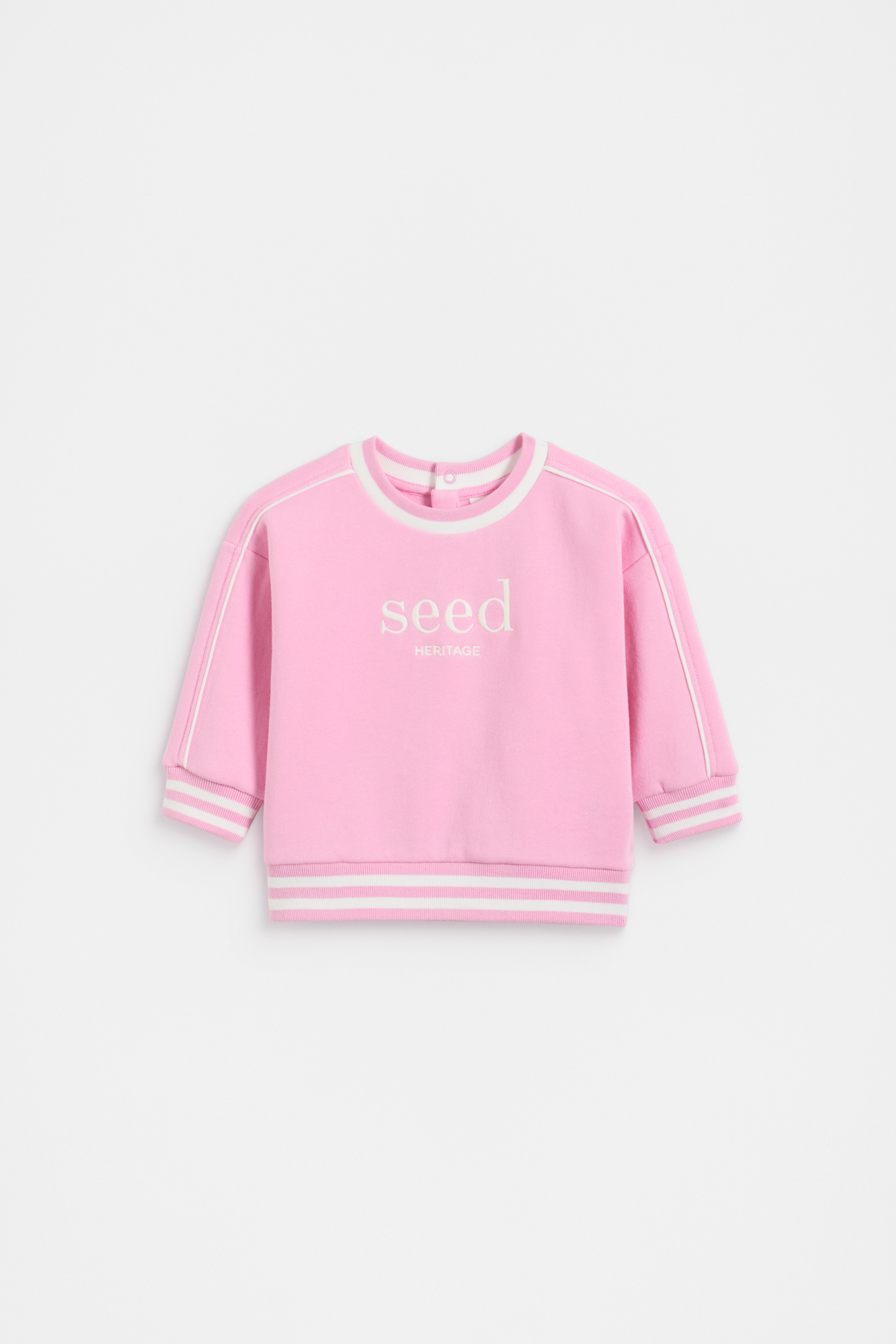 A classic from our logo collection, this sweater is a sweet layer for your little one. Crafted in premium cotton, it features a round neck, long sleeves, an embroidered Seed Heritage logo and contrast stripe details. It secures with buttons at the back of the neck.