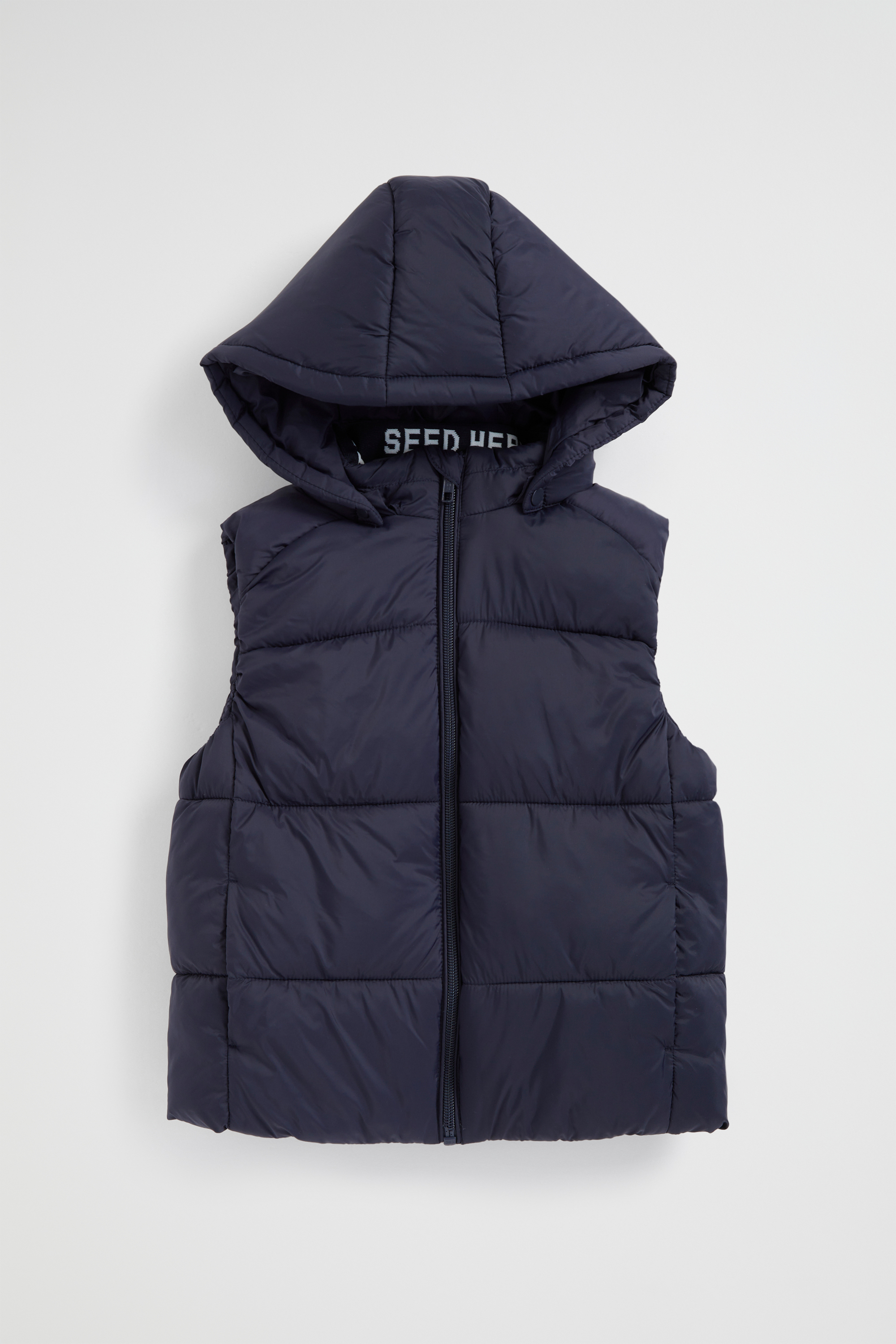 Perfect for layering as the weather cools, this puffer vest features a snap-off hood, zip front and pockets. The zip placard features a Seed Heritage logo for an elevated touch.