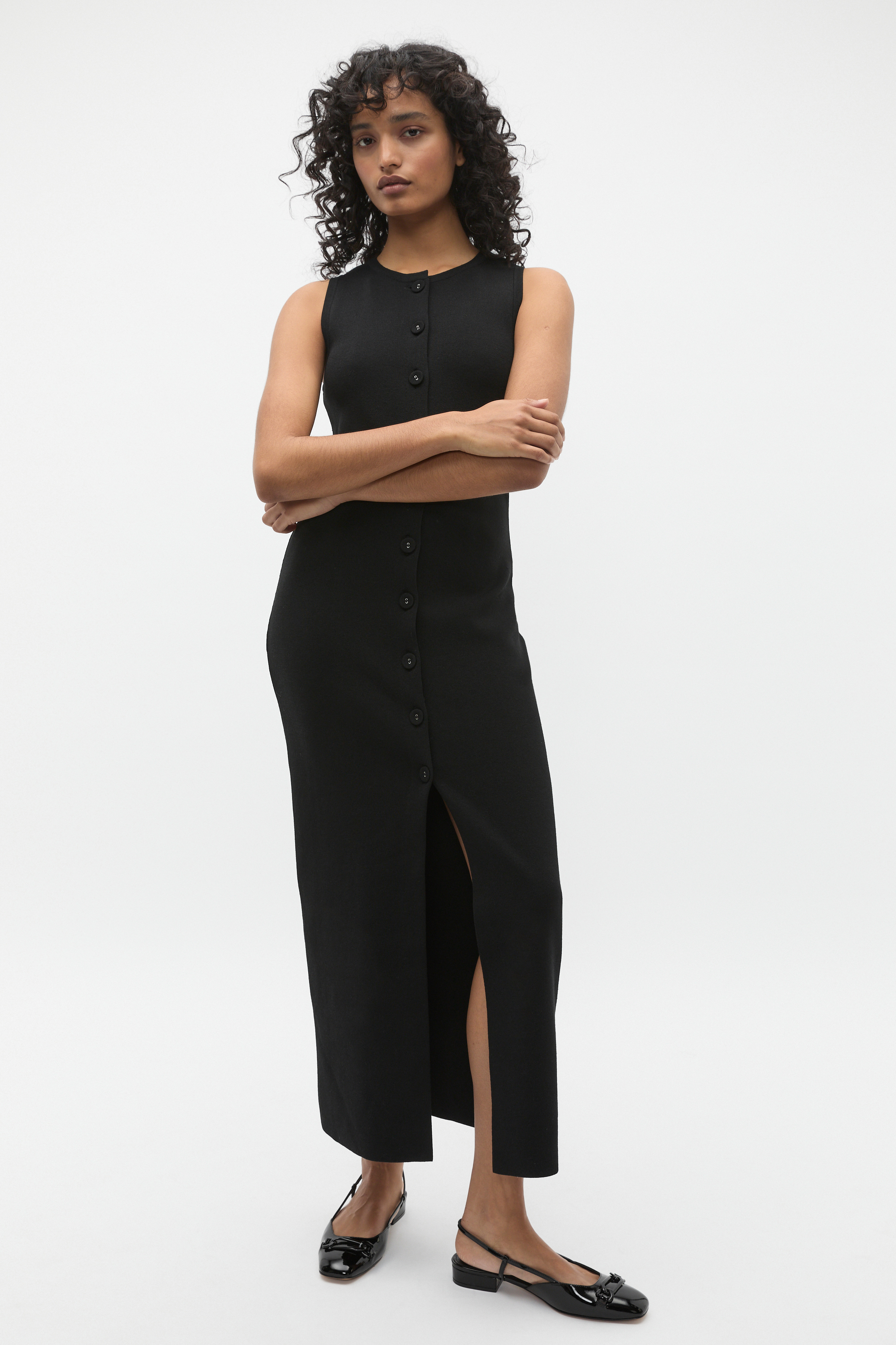 Update your evening wardrobe with this elegant dress, finished with a sleek and simple silhouette. Crafted in a smooth crepe knit, it features a round neck design and is a button-through style falling to a midi length. It has column shape and a stretch fit through the body.