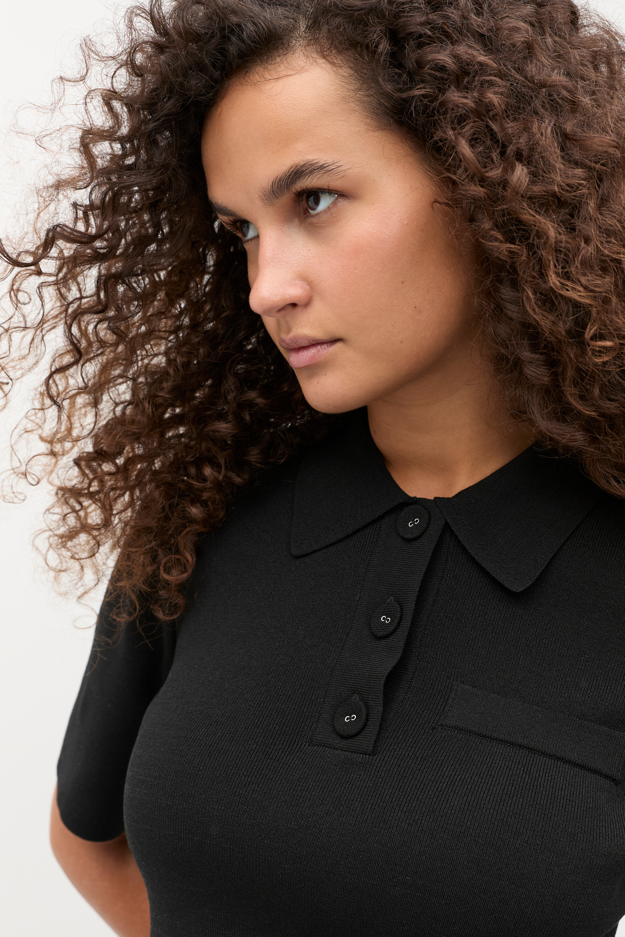 A smart and simple style for the modern wardrobe, this polo has a crepe knit finish and is ready for your every day. It features a button collar, short sleeves, a front pocket and a cropped length.