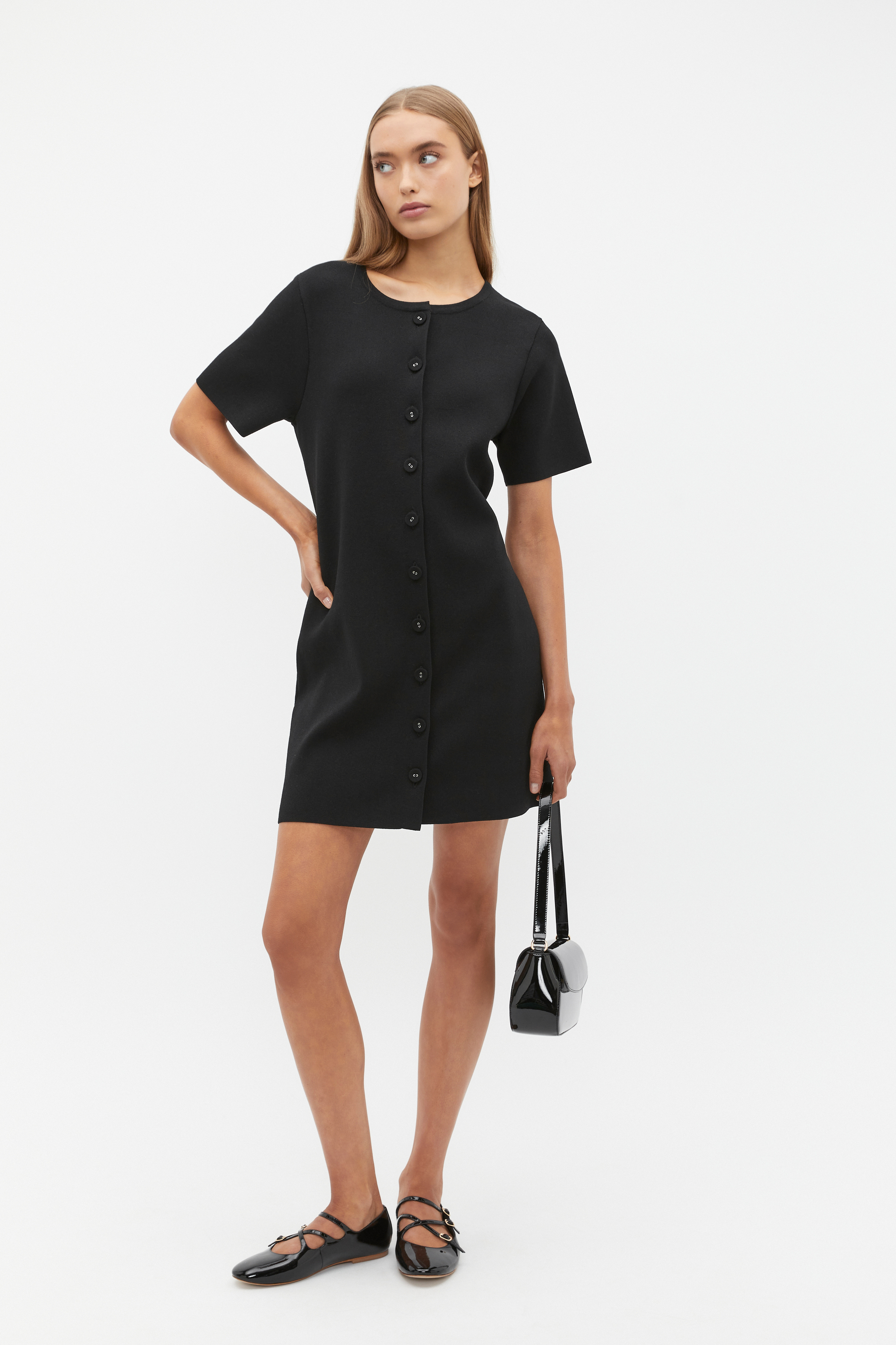 The little black dress of the season, this classic style is a must-have for your wardrobe. Crafted with a crepe knit finish, it features a round neck, short sleeves, a button front and falls to a mini length.