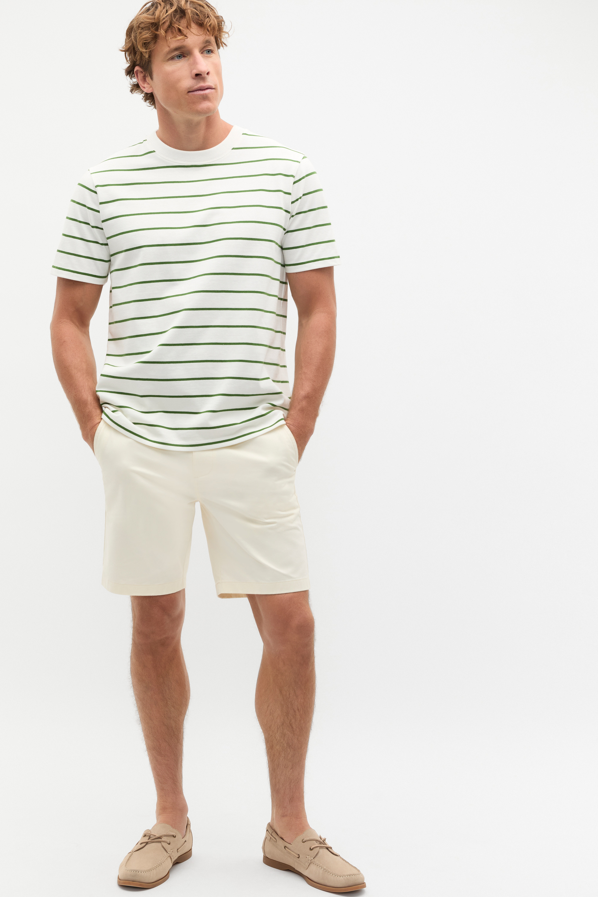 A staple for his transeasonal wardrobe, this crew tee is crafted from breathable cotton. It features a ribbed crew neck, short sleeves, and a tonal stripe pattern.