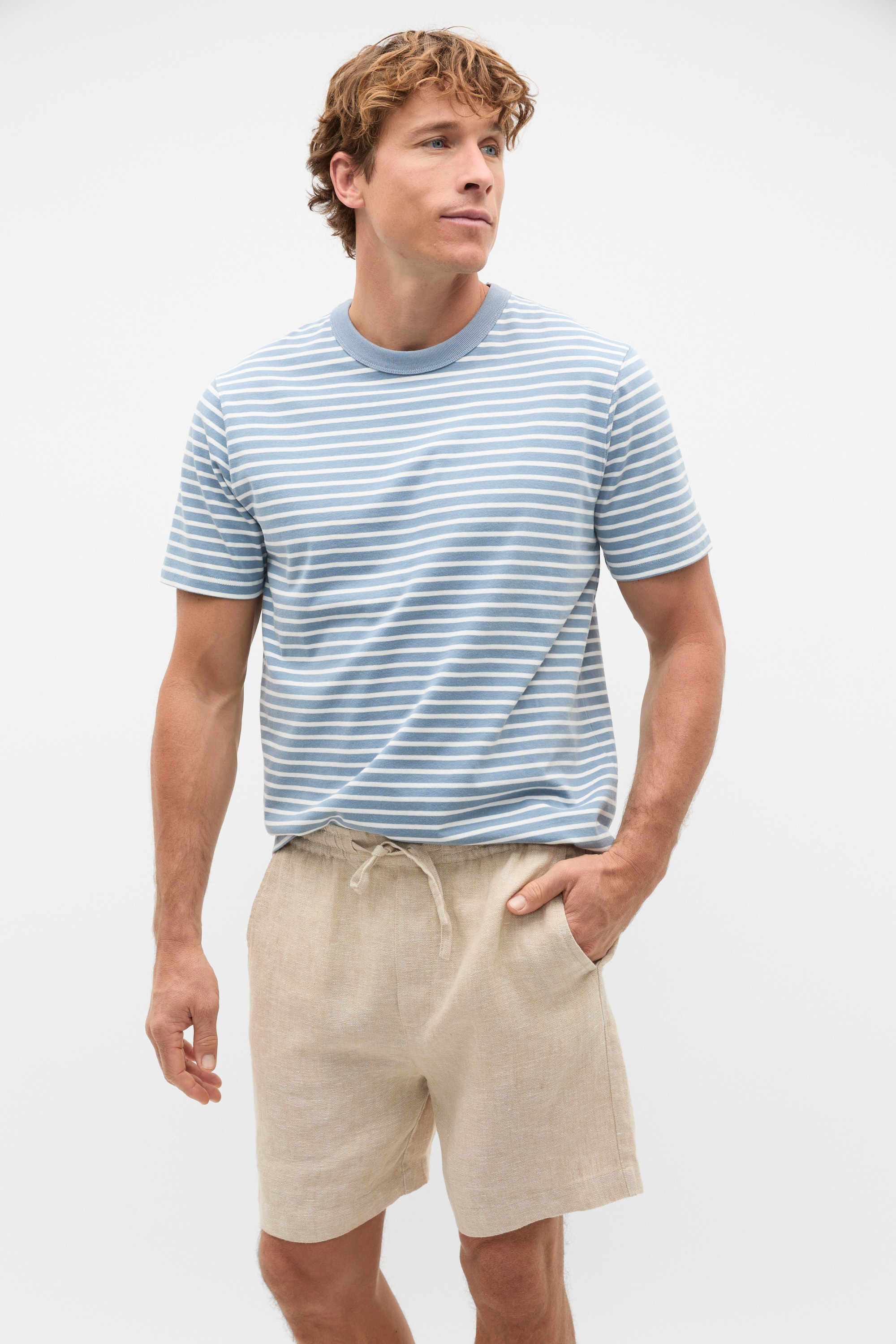 A staple for his transeasonal wardrobe, this crew tee is crafted from breathable cotton. It features a ribbed crew neck, short sleeves, and a tonal stripe pattern.