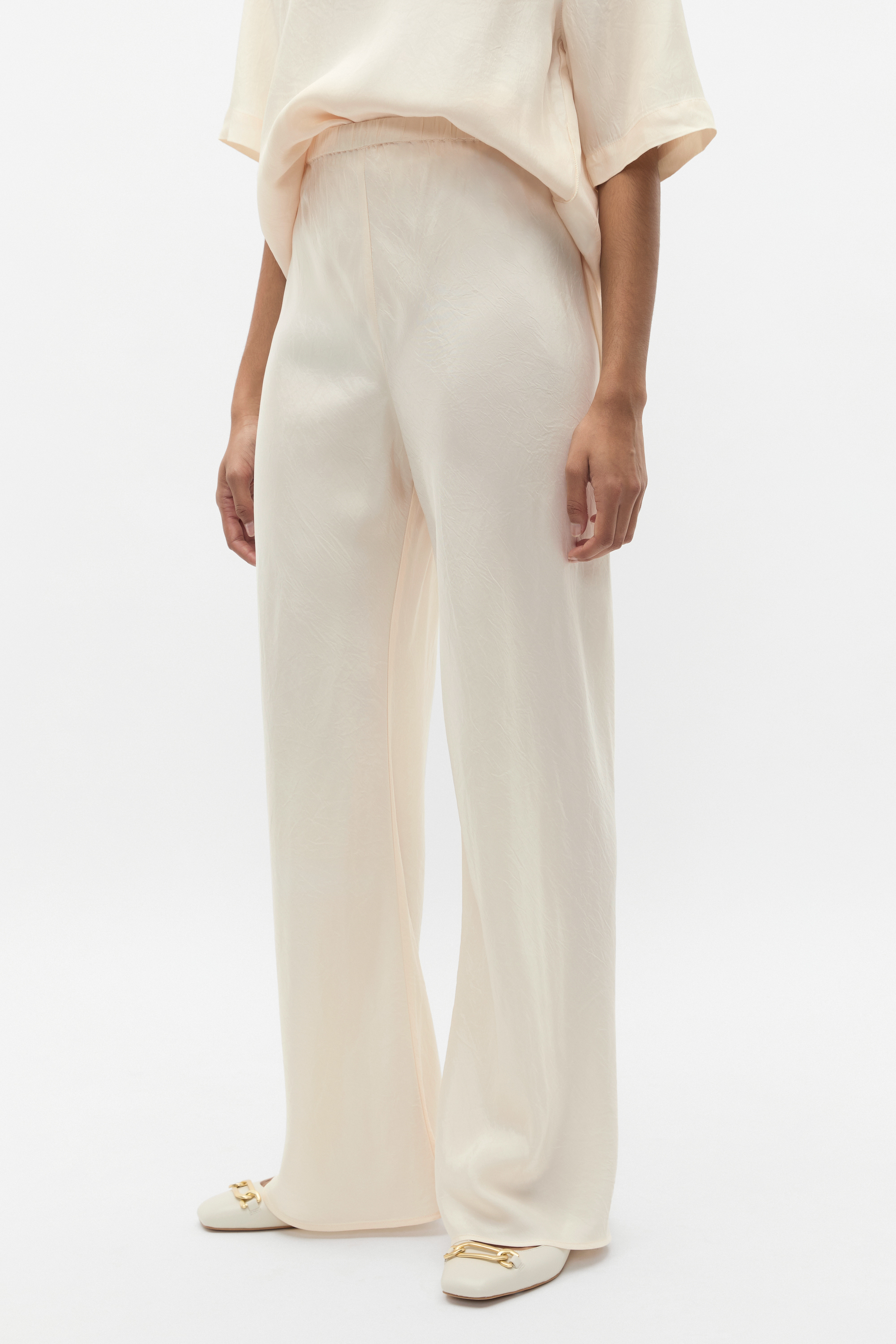 Soft and simple, these pants are finished in a crinkle satin for an elevated feel. They have an elasticated waistband and a straight leg shape. Style with the crinkle satin top for a head-to-toe curated moment.