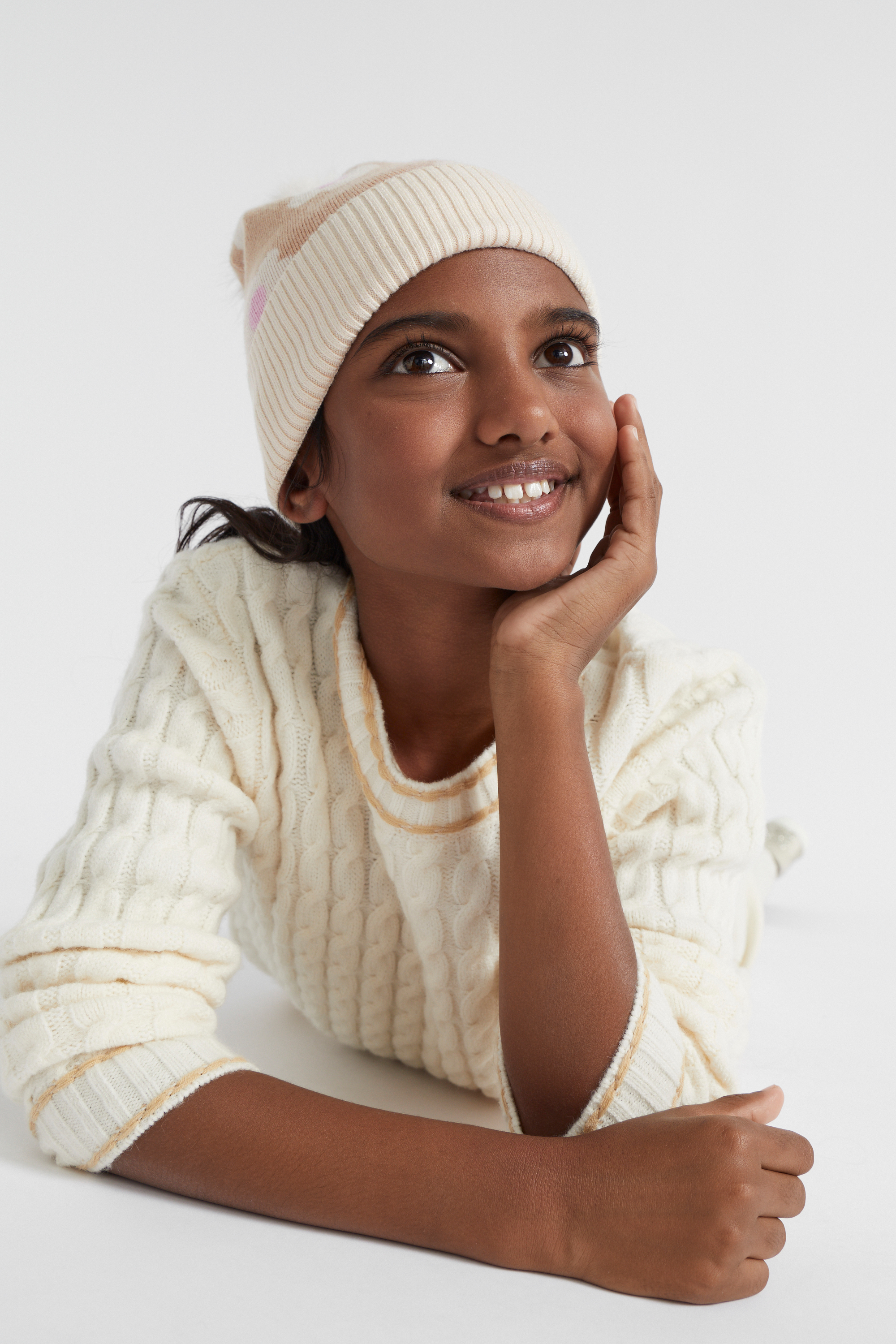 The sweetest finishing touch to any outfit, this beanie features a soft pom pom, a flower pattern, and a folded brim with a ribbed texture.