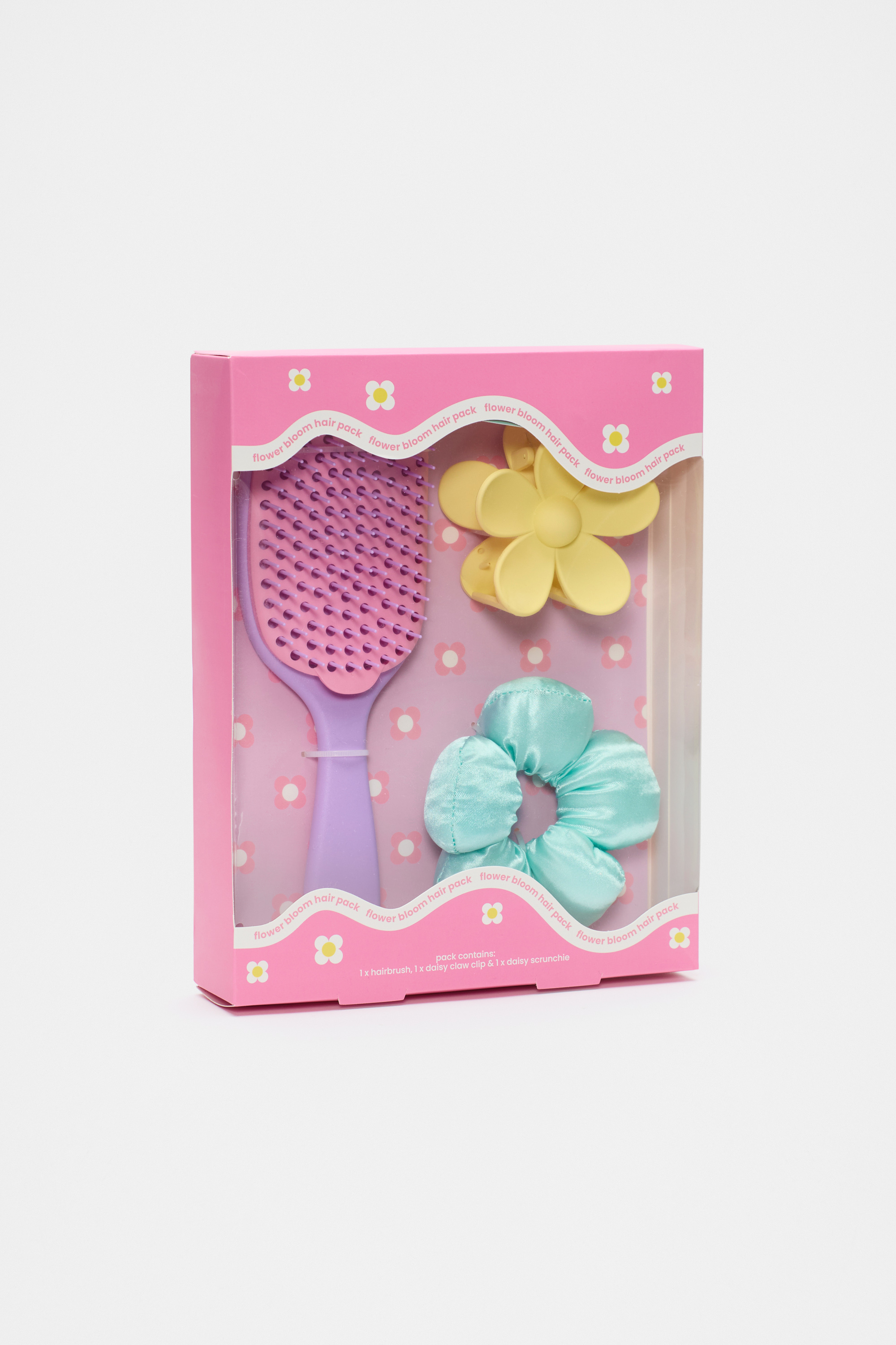 Colourful and sweet, this hair brush pack makes everyday hairstyling fun. Set includes one claw clip, one brush and one satin scrunchie. This product is not a toy and is not suitable for children three years and under.