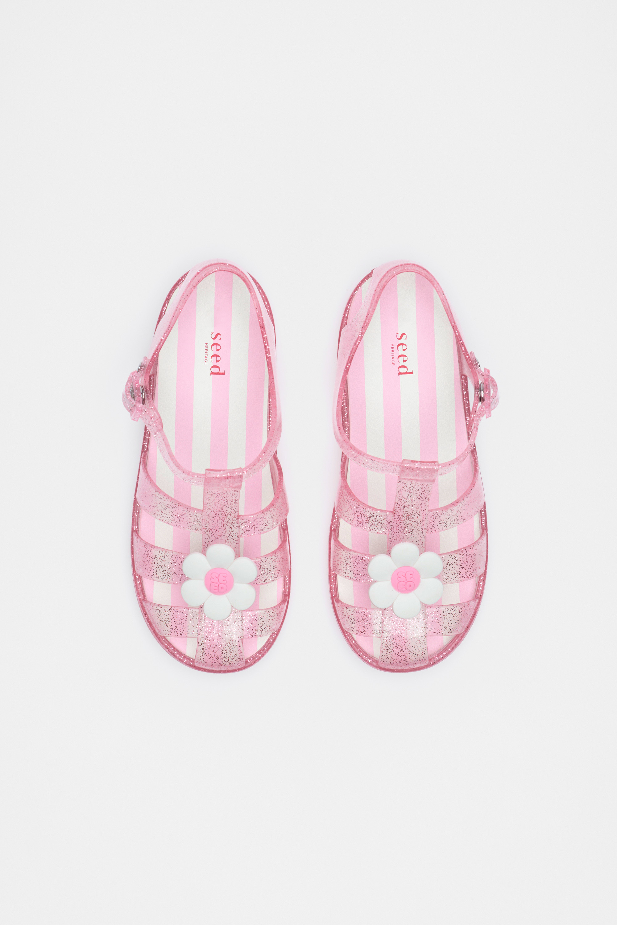 These classic jelly sandals are the sweetest style for her everyday adventuring. They are splash proof and have a removable cushioned inner sole. They feature a caged design with adjustable press stud buckle closure and custom daisy motive. They come in a handy mesh carry case.