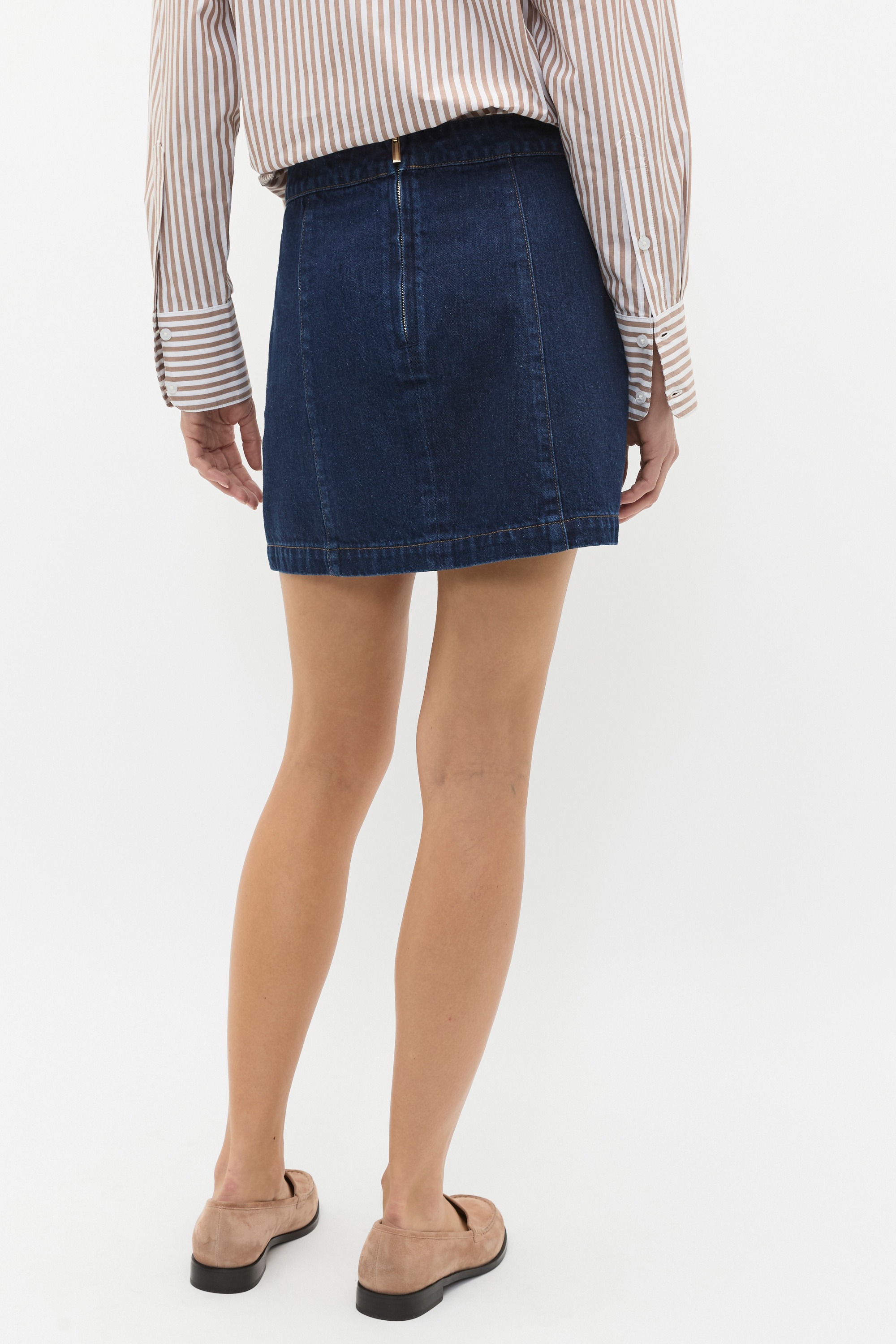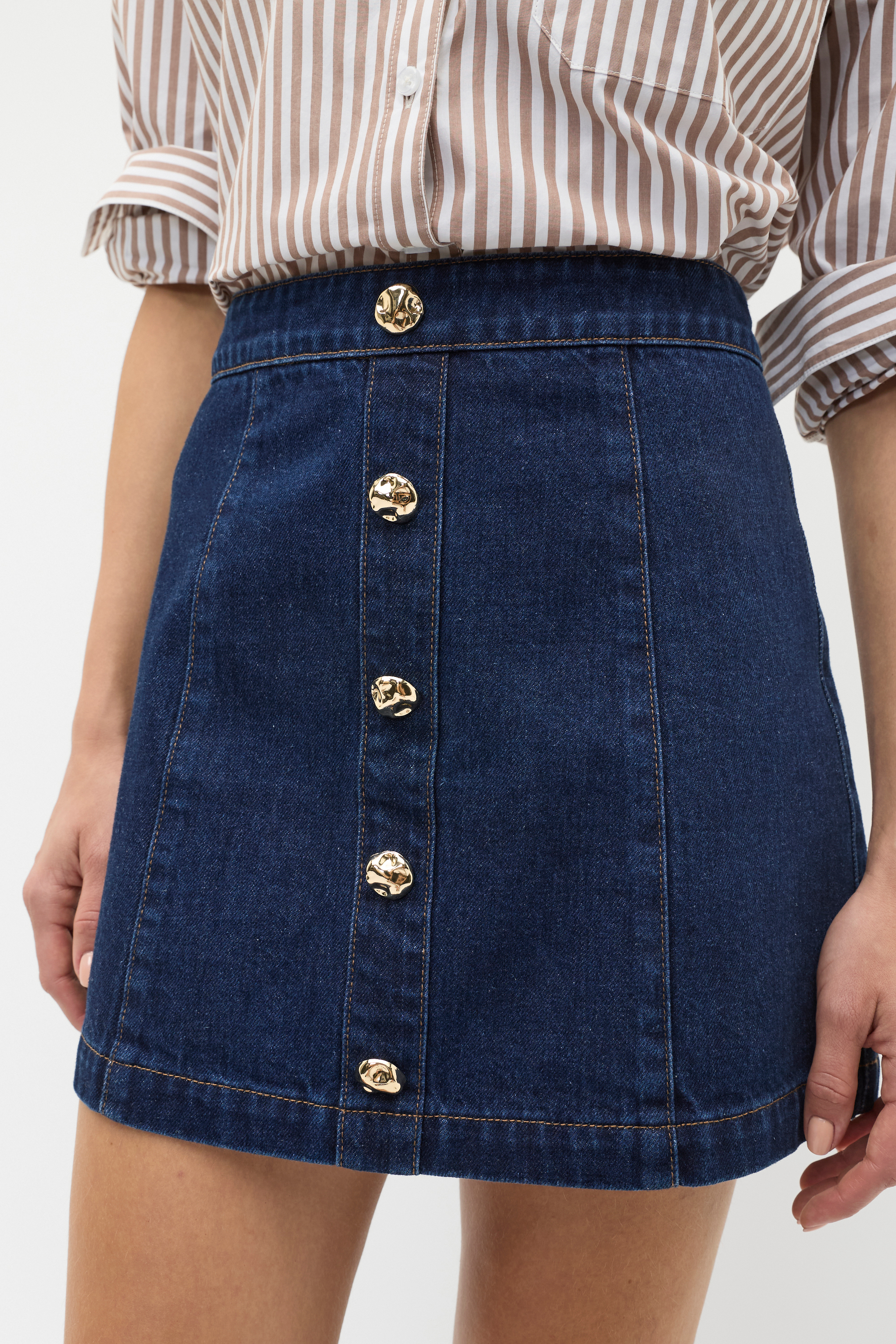Complete your wardrobe update with this denim skirt, a versatile piece for everyday styling. Crafted in premium cotton, it features a fixed waistband that secures with a rear zip and is detailed with a decorative gold button front and contrast stitching. By choosing our cotton products you're supporting our investment in Better Cotton's mission. This product was sourced via a system of mass balance and therefore may not contain Better Cotton.