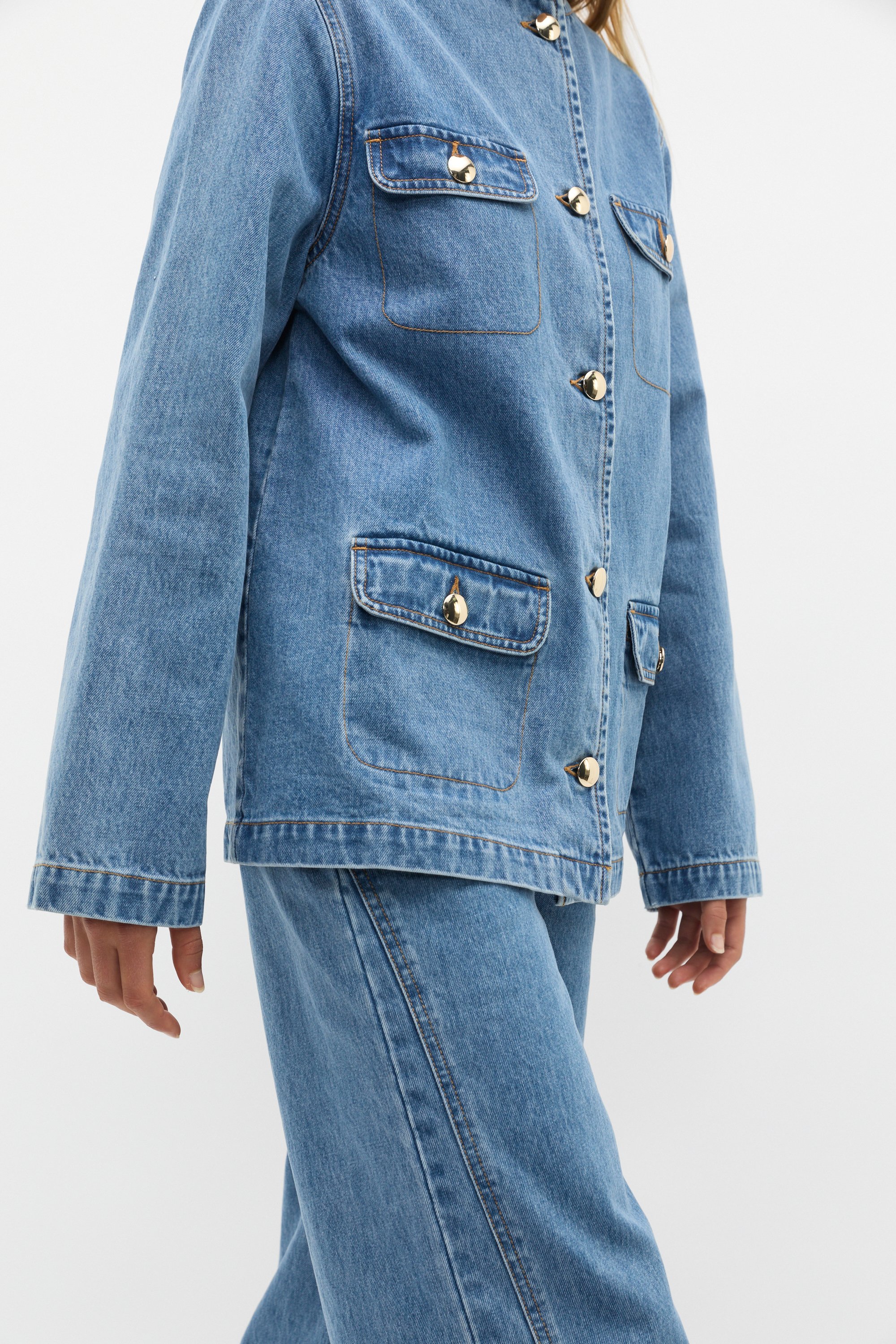 Add a contemporary silhouette to your new-season styling with this chic collarless jacket. Featuring a medium weight denim, it has a round neck design, a drop shoulder, long sleeves and a button-through front. For added interest, it also features four front pockets and is detailed with contrast stitching.
