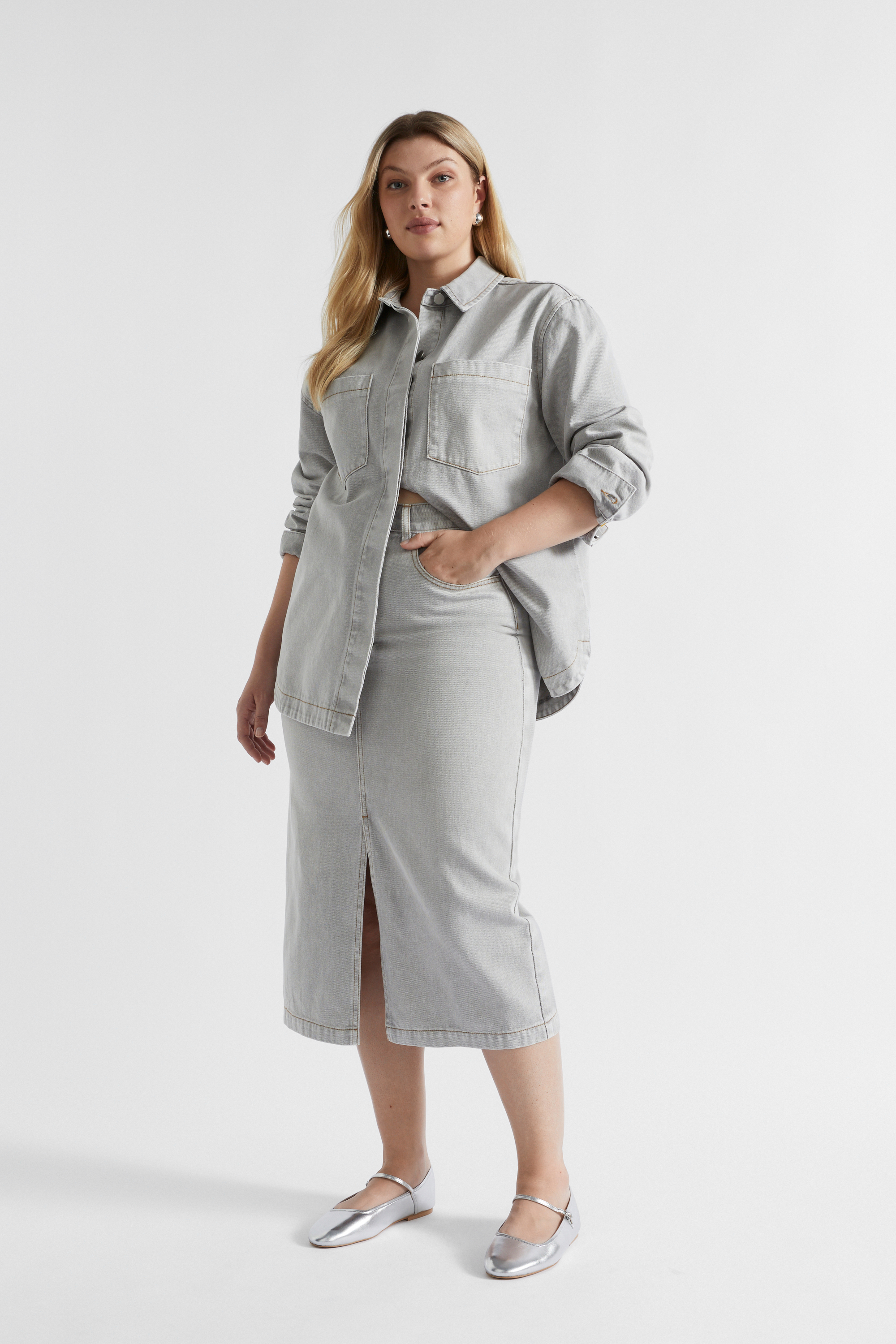 Crafted from classic rigid denim, this is a staple piece for your wardrobe. The midi skirt features a fixed waistband with a button and fly closure, curved front pockets and back patch pockets. It also has contrast stitching details and a split at the front for movement. By choosing our cotton products, you are supporting our investment in the Better Cotton mission.