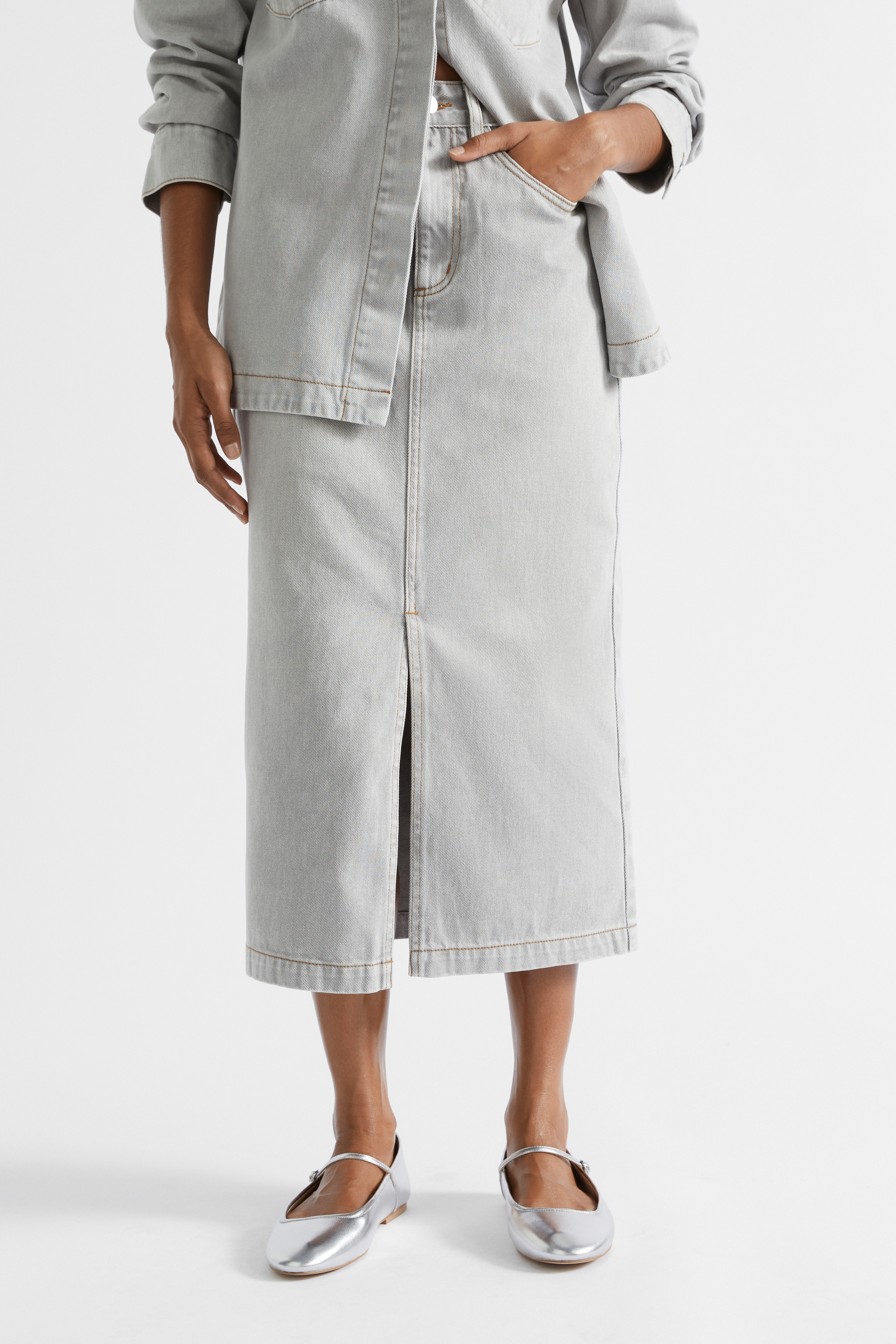 Crafted from classic rigid denim, this is a staple piece for your wardrobe. The midi skirt features a fixed waistband with a button and fly closure, curved front pockets and back patch pockets. It also has contrast stitching details and a split at the front for movement. By choosing our cotton products, you are supporting our investment in the Better Cotton mission.